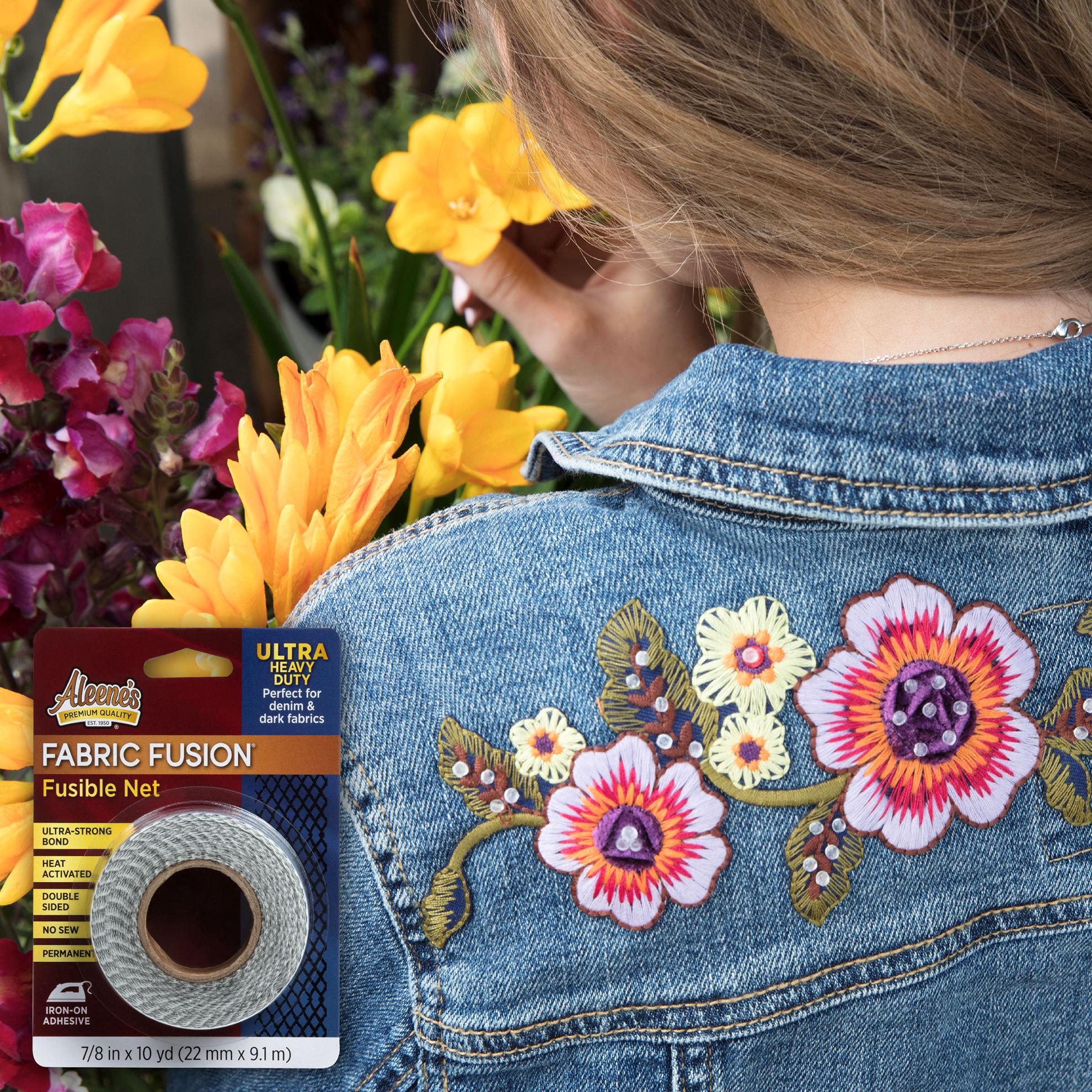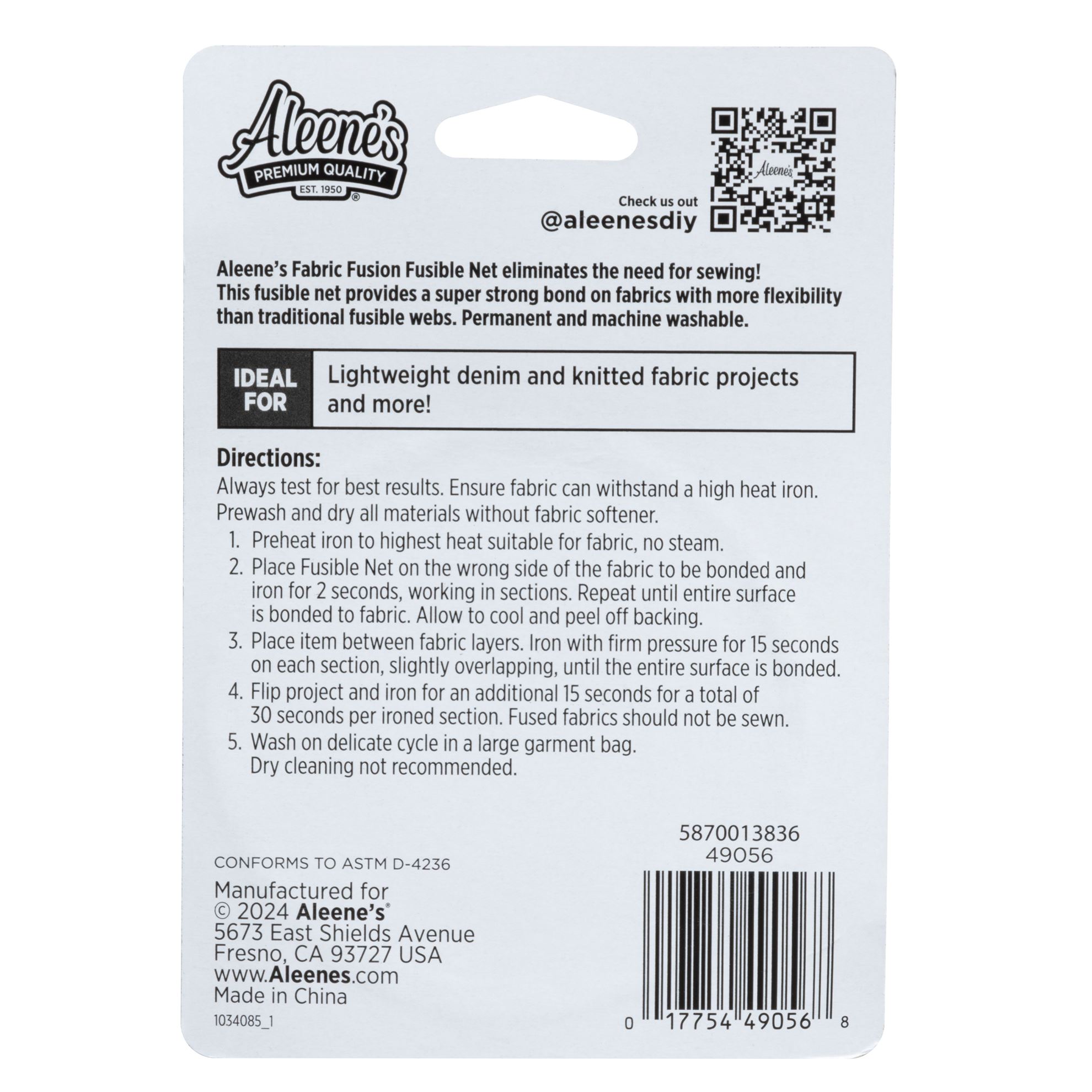 Aleene’s Fabric Fusion Fusible Net eliminates the need for sewing! This fusible net provides a super strong bond on fabrics with more flexibility than traditional fusible webs. Permanent and machine washable. Ideal for lightweight denim, knitted fabric projects, and more! Includes (1) 7/8 in x 10 yd roll of Aleene’s Fabric Fusion Fusible Net.