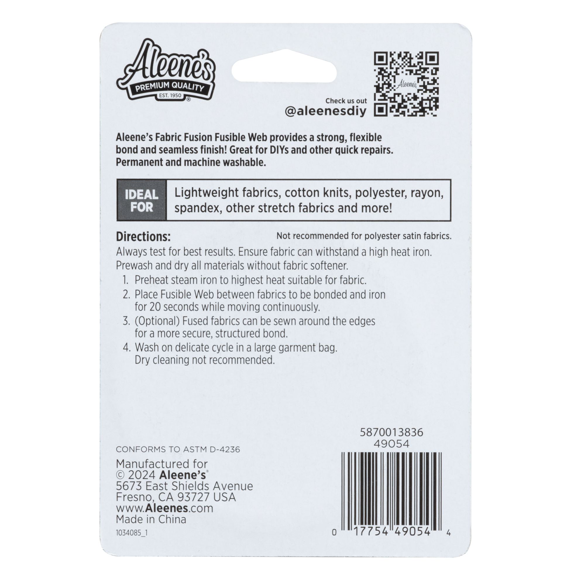 Aleene’s Fabric Fusion Fusible Web provides a strong, flexible, and seamless bond that won’t peel or weaken after washing! Permanent and machine washable. Ideal for lightweight fabrics, cotton knits, polyester, rayon, spandex, other stretch fabrics, and more! Not recommended for polyester satin fabrics. Includes (1) 5/8 in x 18 yd roll of Aleene’s Fabric Fusion Lite Fusible Web (Black).