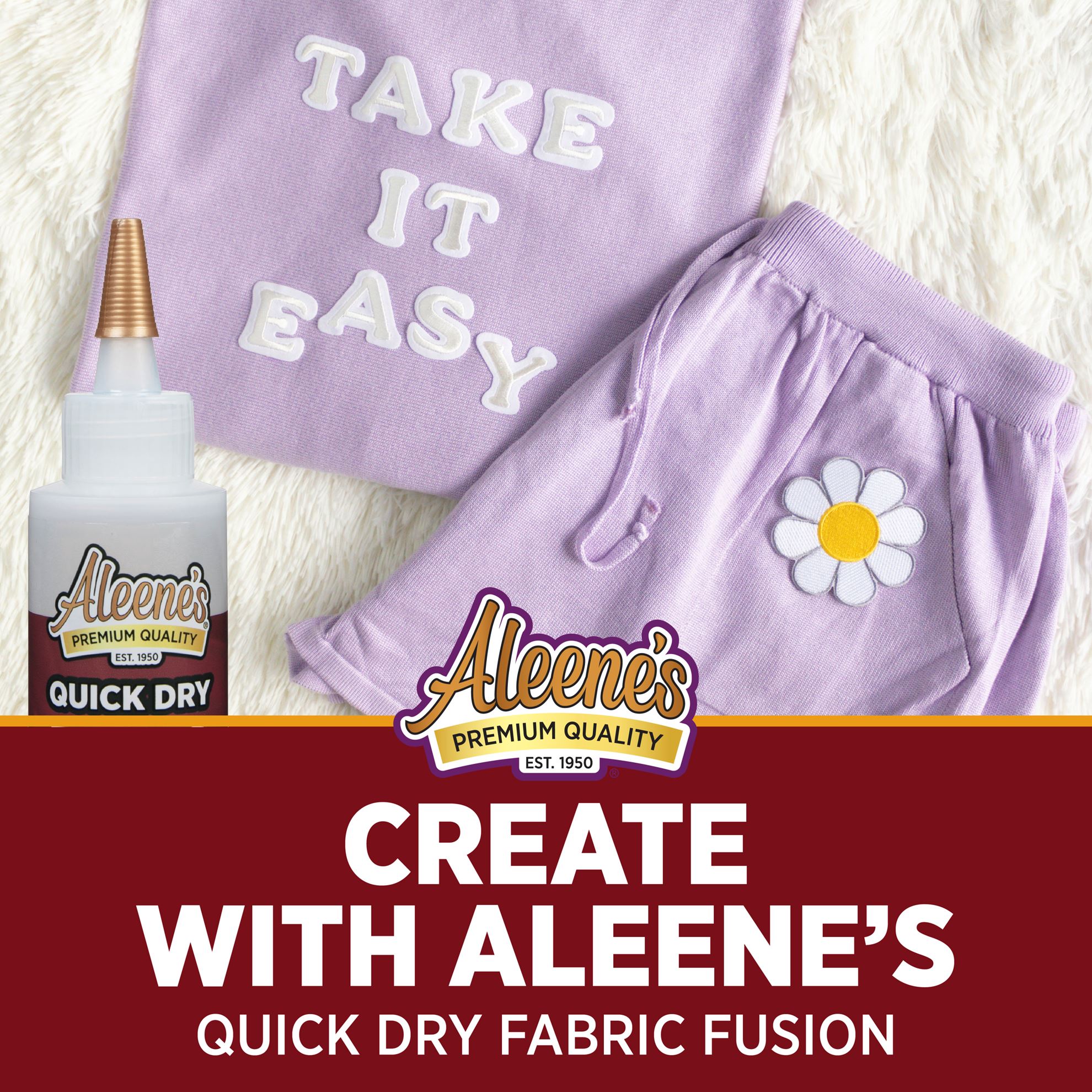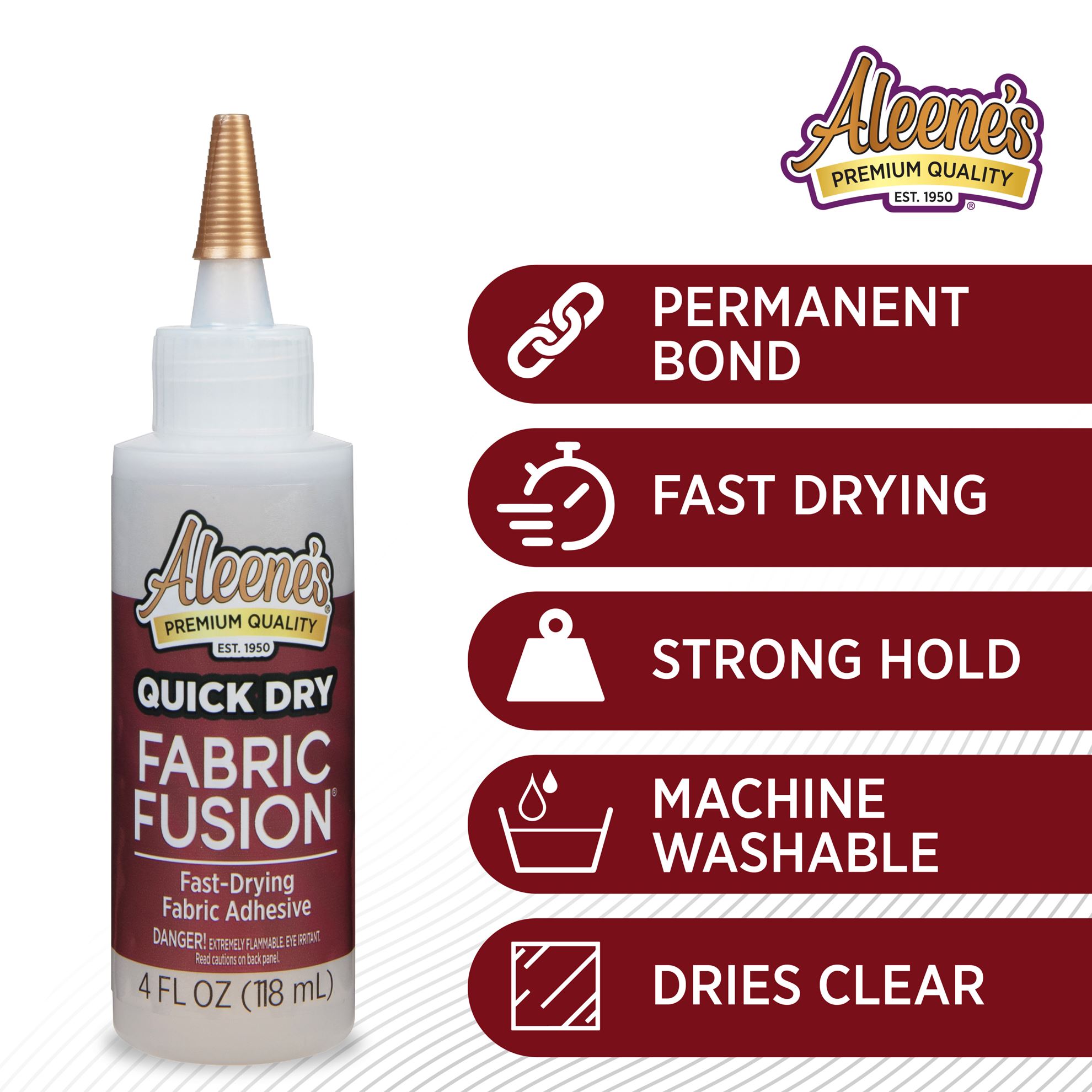 Whether you know how to sew and don’t have time, or have never picked up a needle and thread in your life, Fabric Fusion is an easy alternative! This super strong fabric glue dries up to 5 times faster than our original formula; it adheres all kinds of fabrics and embellishments to other fabrics for a permanent bond that remains flexible, even after washing. Features 1 (4 fl. oz.) bottle of Aleene’s Quick Dry Fabric Fusion.