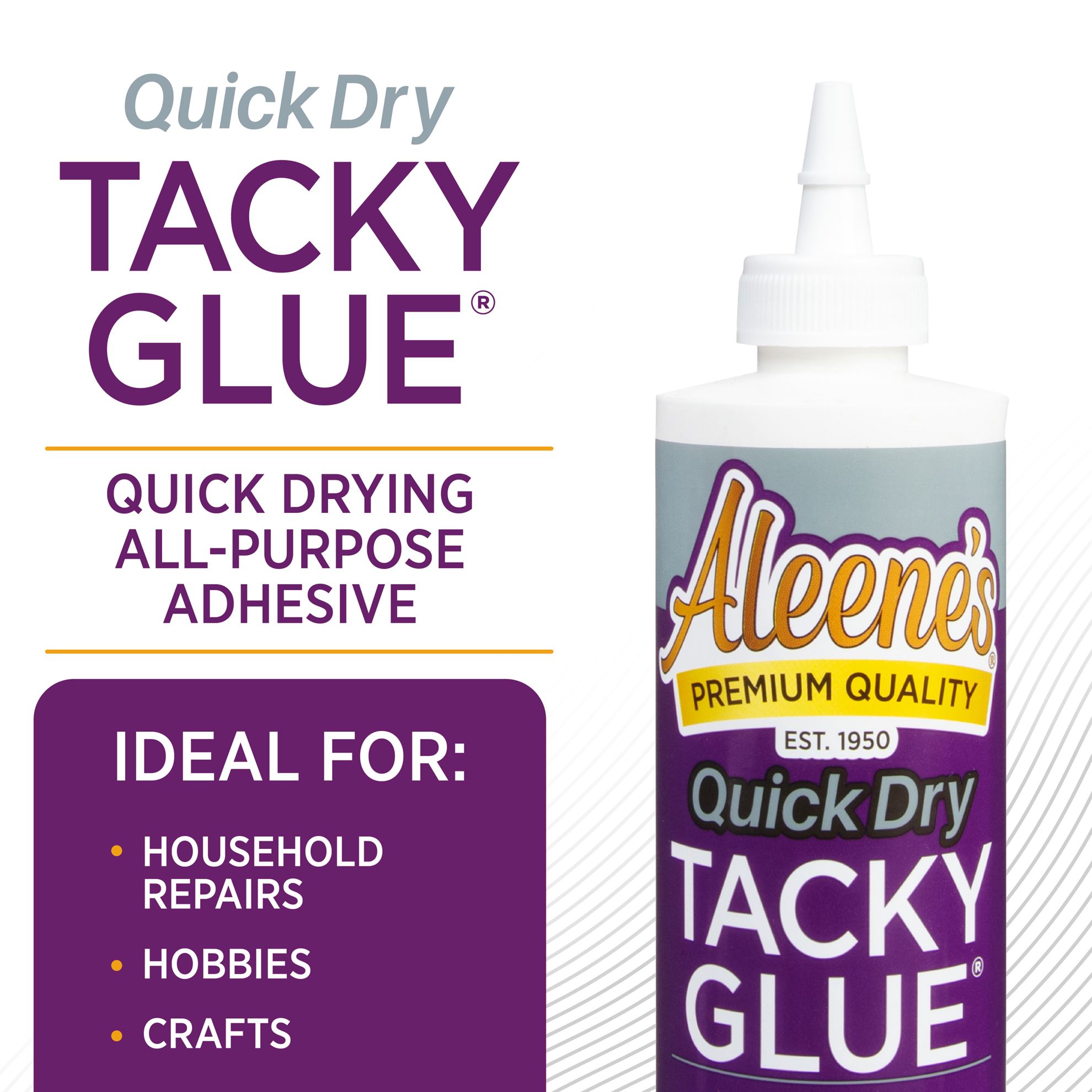 When there’s no time to waste, turn to Aleene’s Quick Dry Tacky Glue! Its thick, nontoxic tacky formula grabs items on contact and dries clear, permanent, and 50% faster than our original Tacky Glue! Great for crafts, hobbies, DIYs and household repairs. Features 1 (8 fl. oz.) bottle of Aleene’s Quick Dry Tacky Glue.