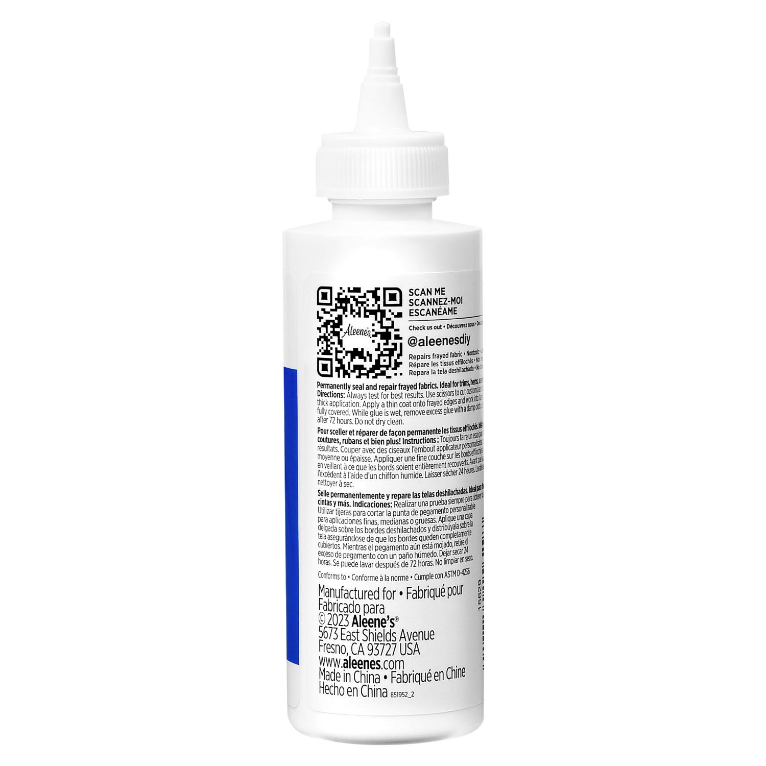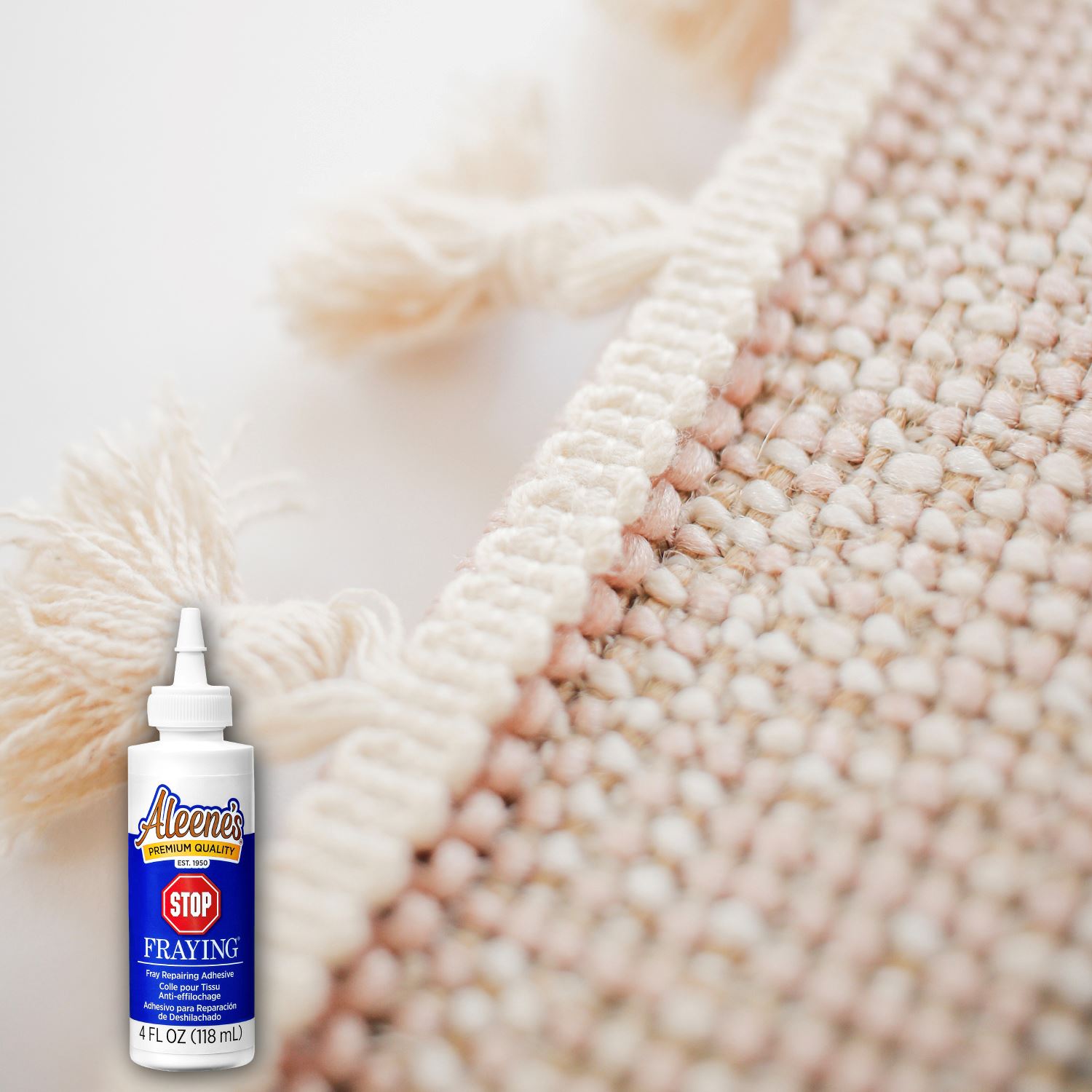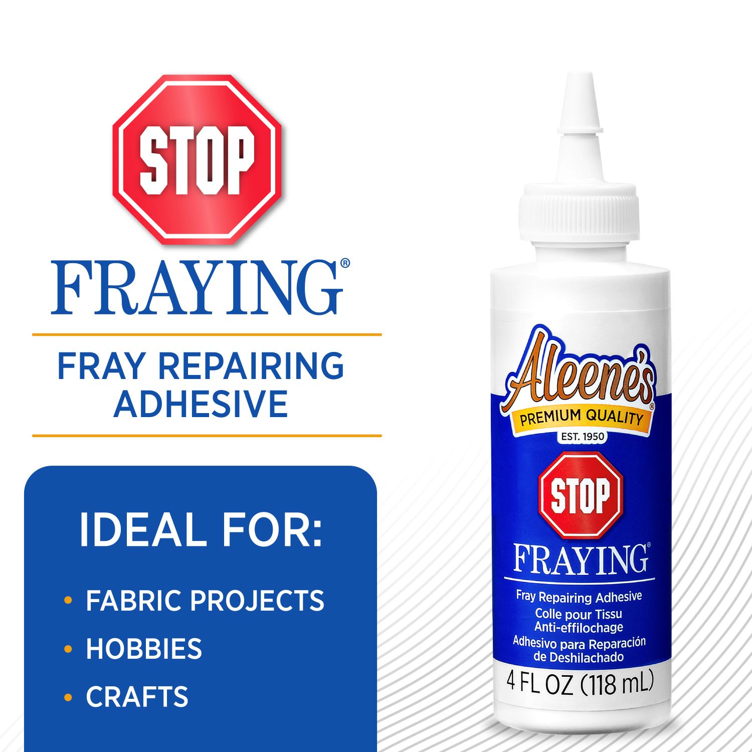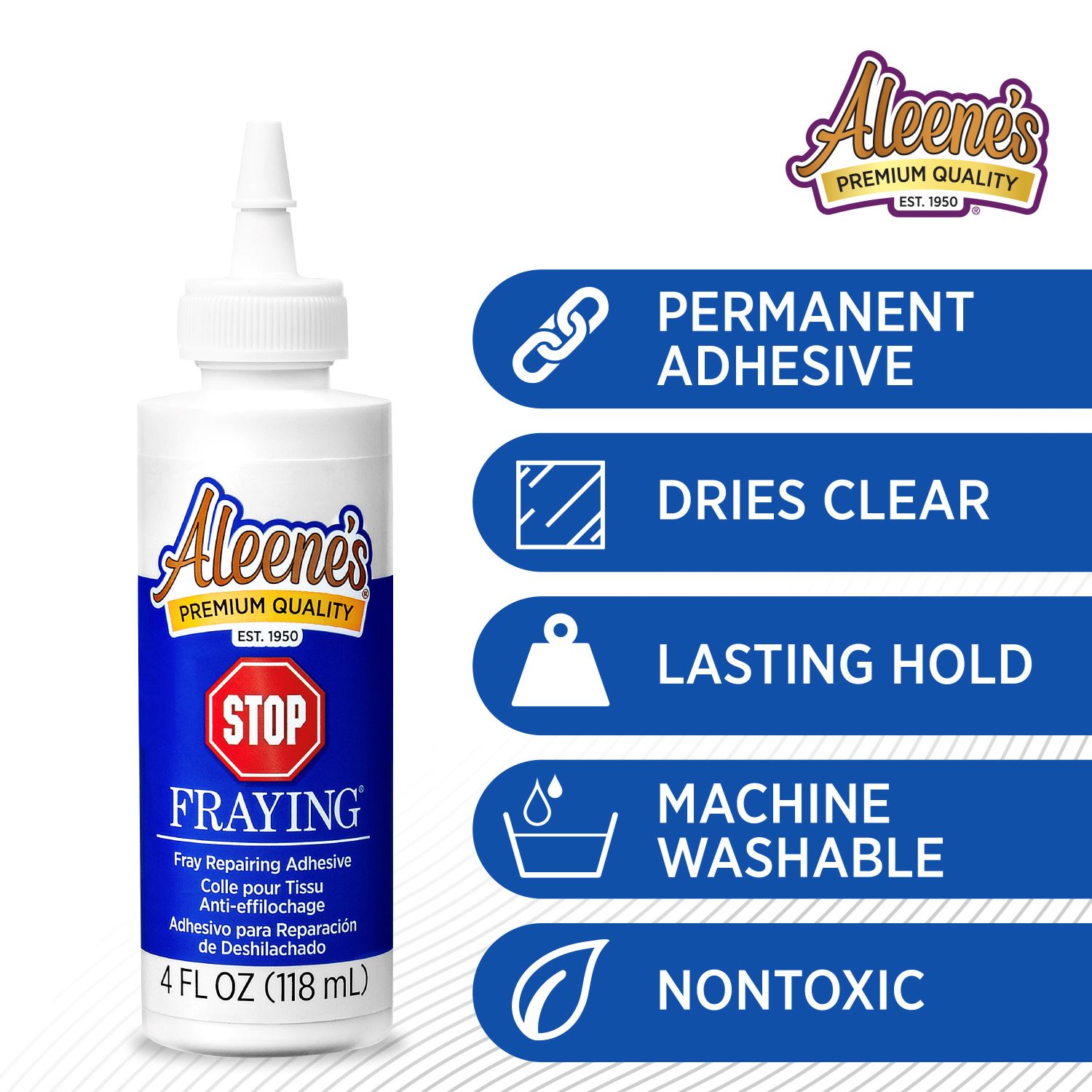Keep fabrics and trims from fraying with Aleene’s Stop Fraying Permanent Fabric Adhesive! This permanent fabric glue is great for fabric repairs, creating hems and seams, and gluing and sealing braids and trims! Its nontoxic formula dries clear, flexible and machine washable. Features 1 (4 fl. oz.) bottle of Aleene’s Stop Fraying Permanent Fabric Adhesive.