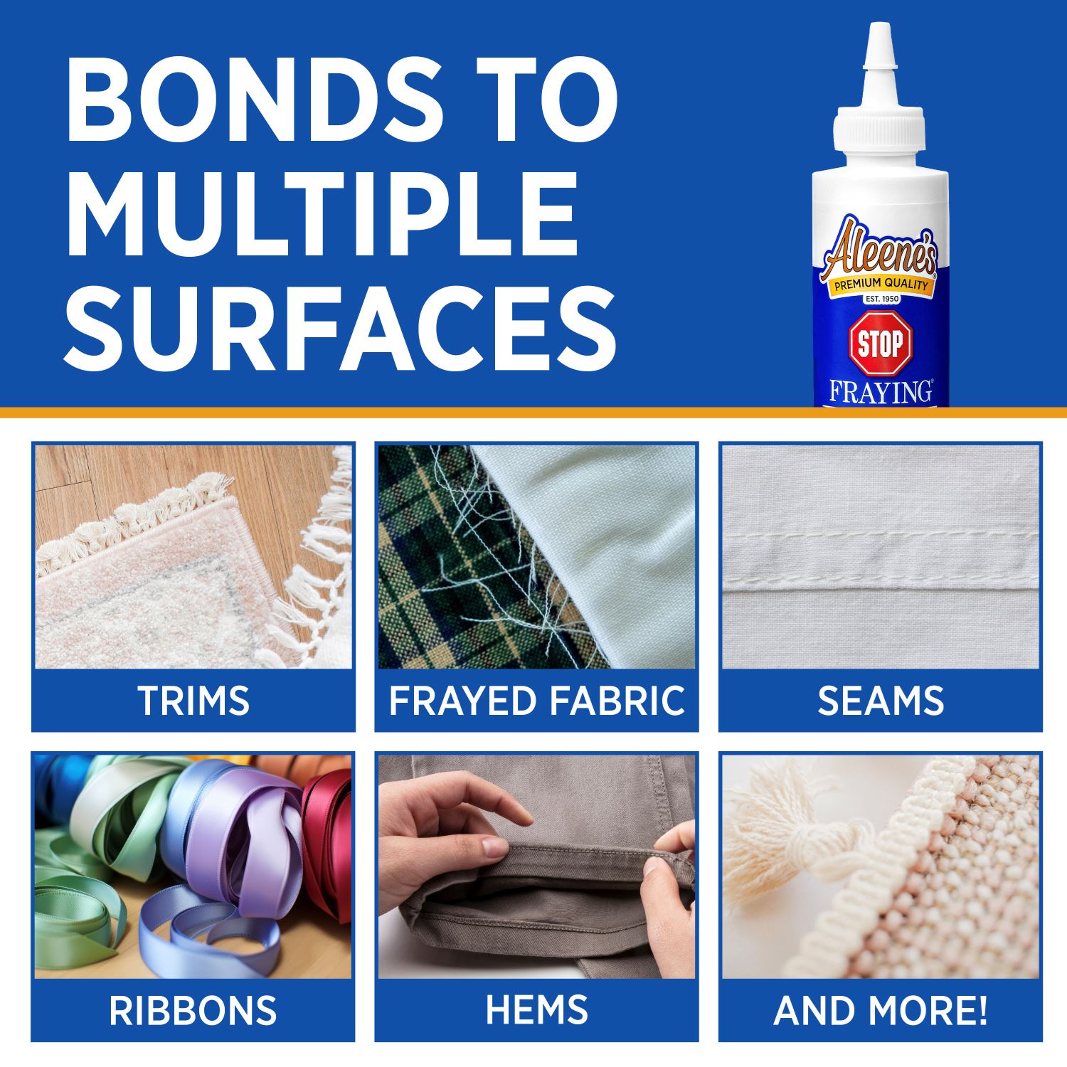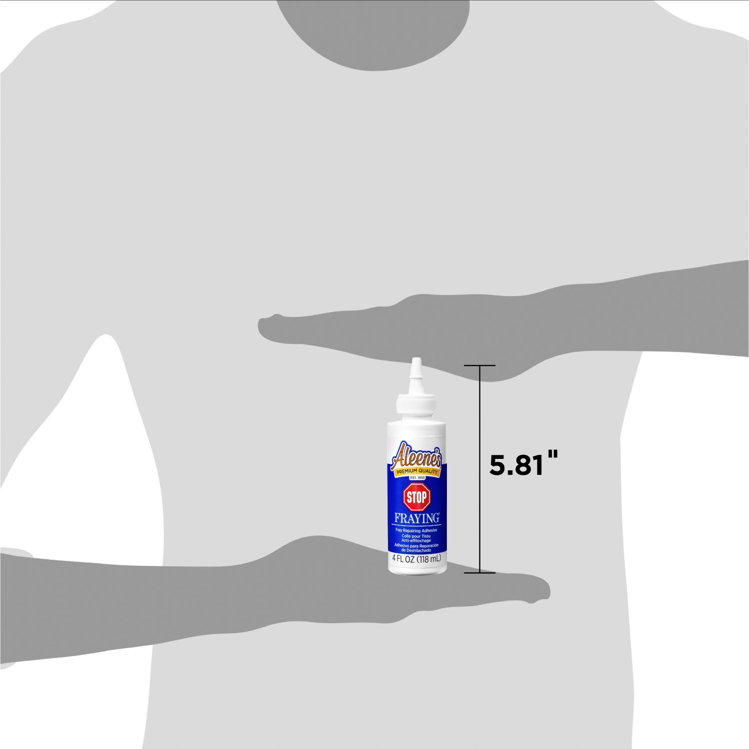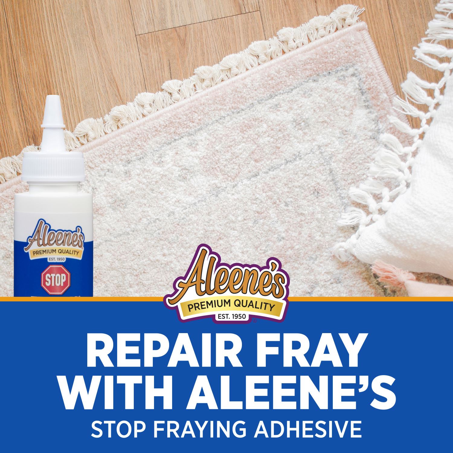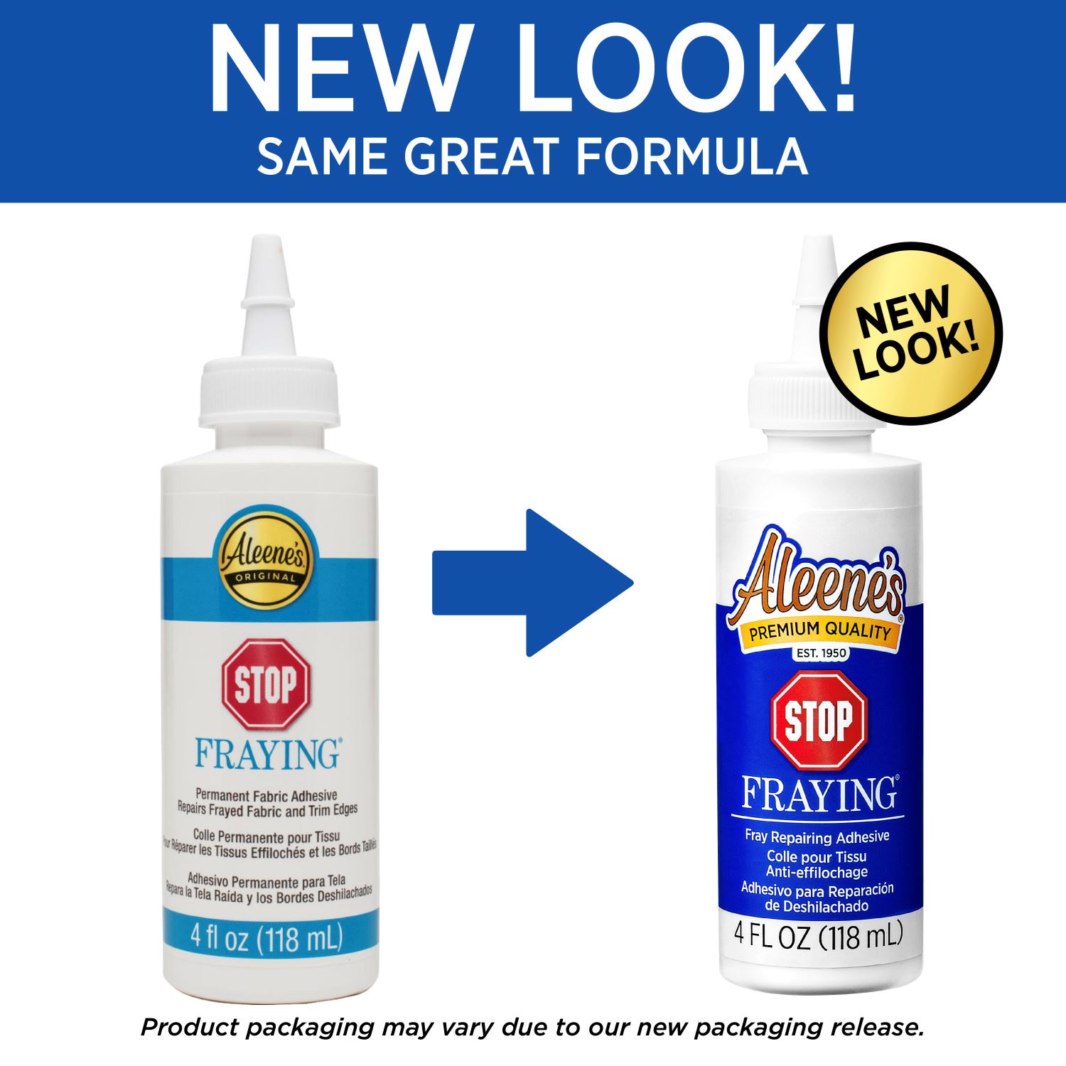 Keep fabrics and trims from fraying with Aleene’s Stop Fraying Permanent Fabric Adhesive! This permanent fabric glue is great for fabric repairs, creating hems and seams, and gluing and sealing braids and trims! Its nontoxic formula dries clear, flexible and machine washable. Features 1 (4 fl. oz.) bottle of Aleene’s Stop Fraying Permanent Fabric Adhesive.