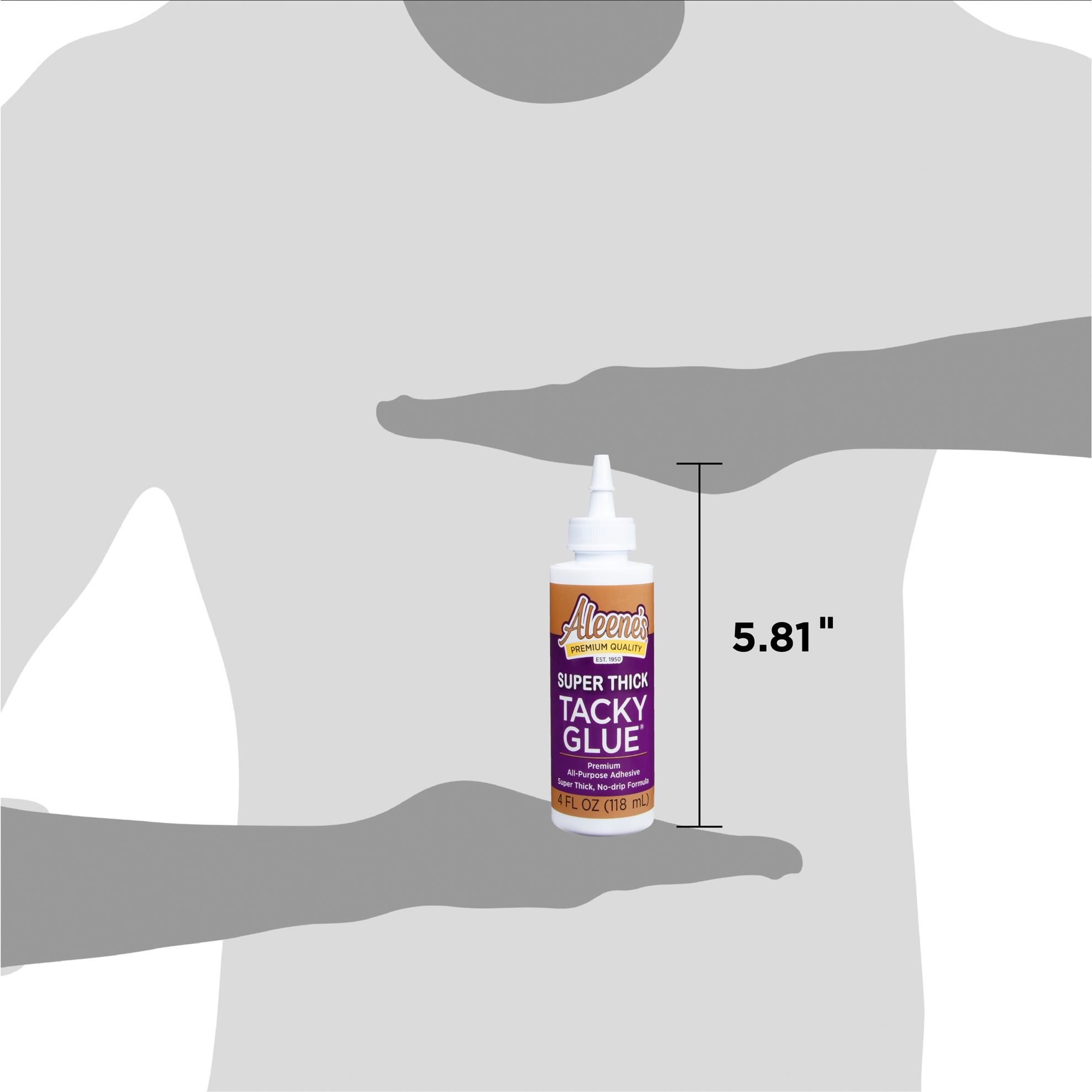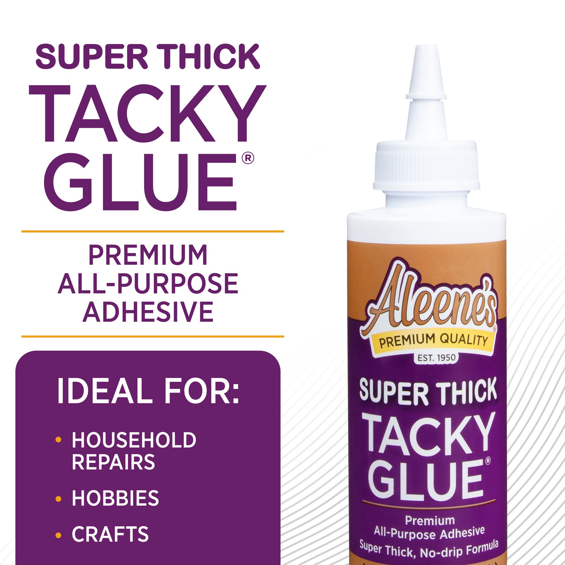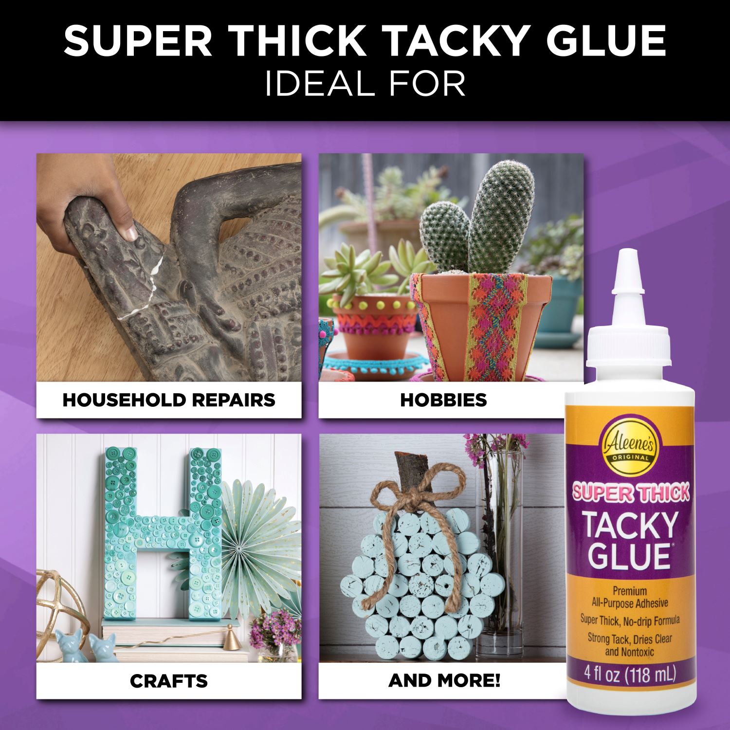 Get glue-gun strength without the heat! Super Thick Tacky Glue’s incredibly thick, no-run formula is fast tacking and grabs hard-to-hold items on contact. This all-purpose glue dries clear and withstands both heat and cold, making it super versatile and dependable for a variety of projects. Great for crafts, hobbies, DIYs and household repairs. Features 1 (4 fl. oz.) bottle of Aleene’s Super Thick Tacky Glue.