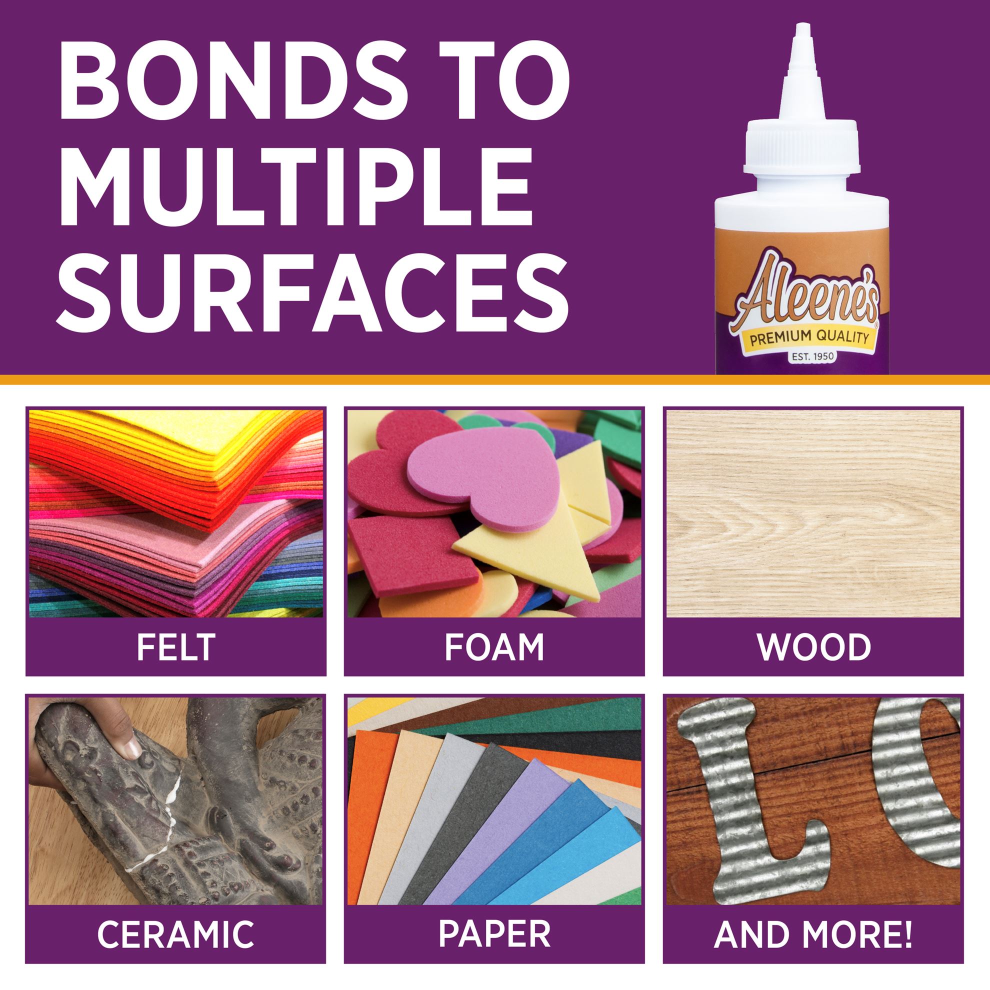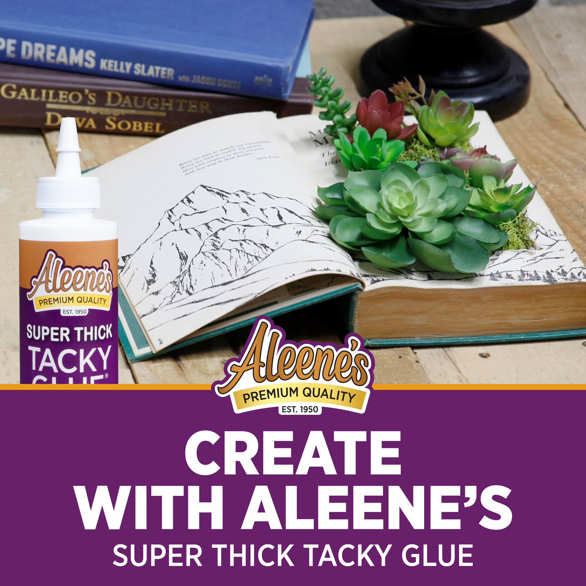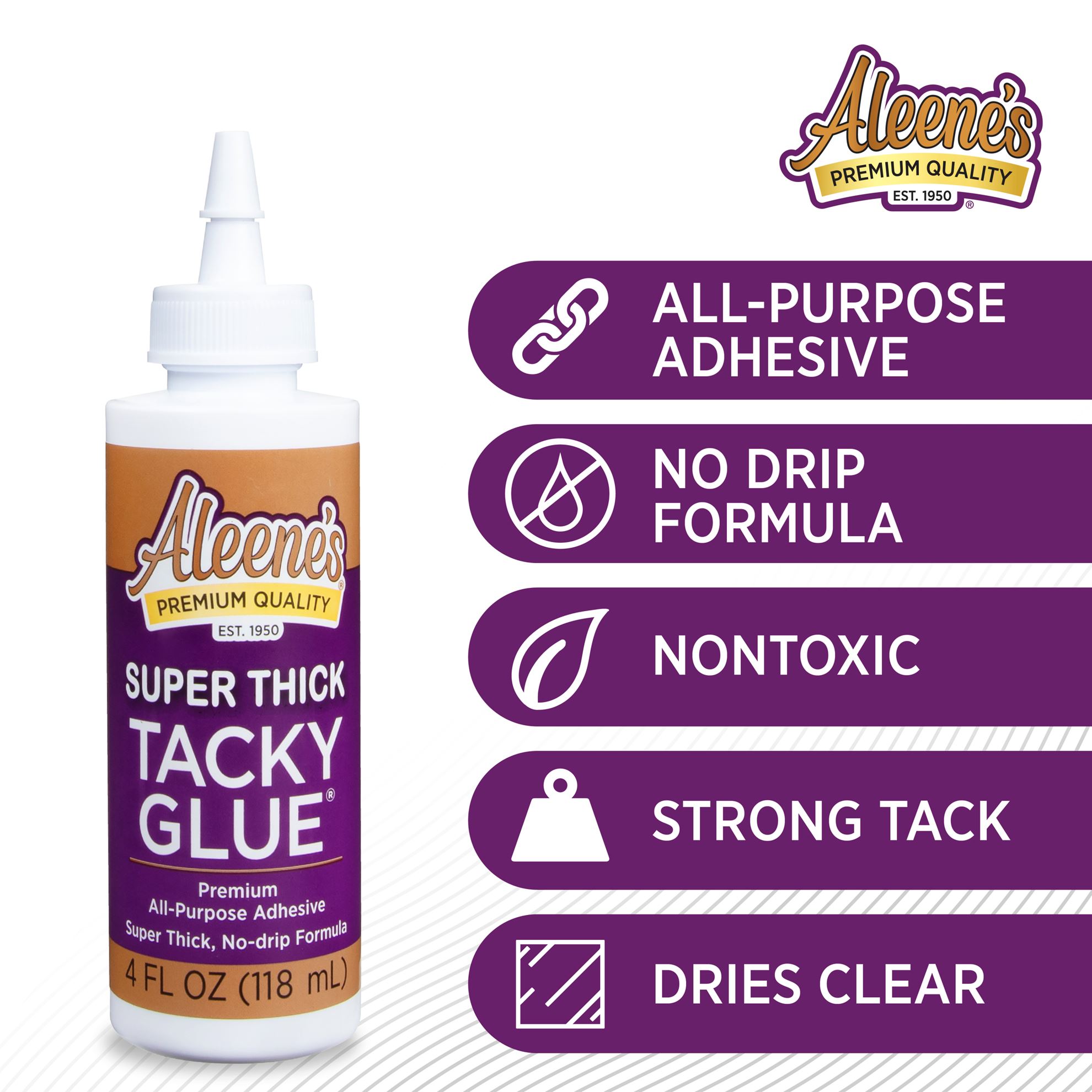 Get glue-gun strength without the heat! Super Thick Tacky Glue’s incredibly thick, no-run formula is fast tacking and grabs hard-to-hold items on contact. This all-purpose glue dries clear and withstands both heat and cold, making it super versatile and dependable for a variety of projects. Great for crafts, hobbies, DIYs and household repairs. Features 1 (4 fl. oz.) bottle of Aleene’s Super Thick Tacky Glue.