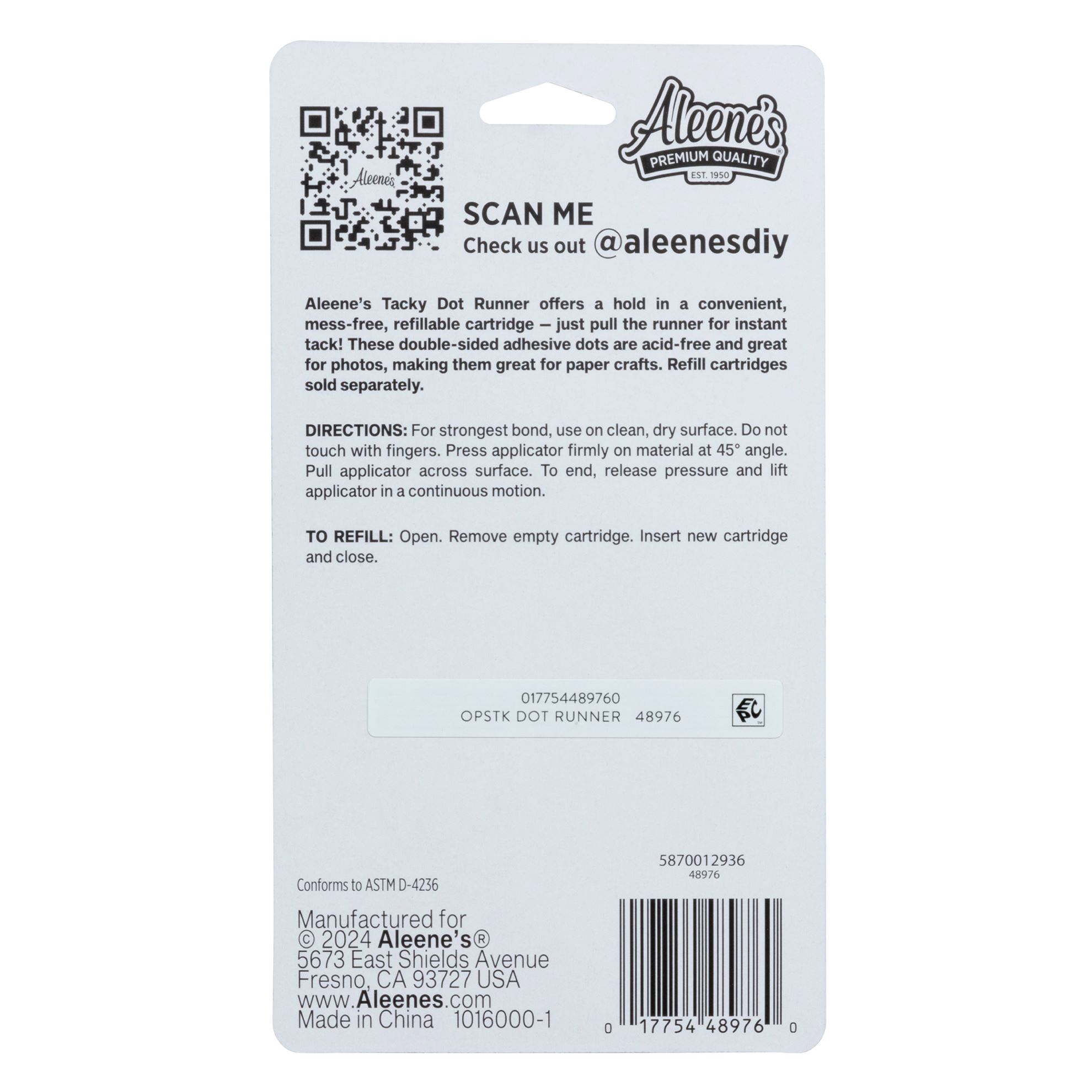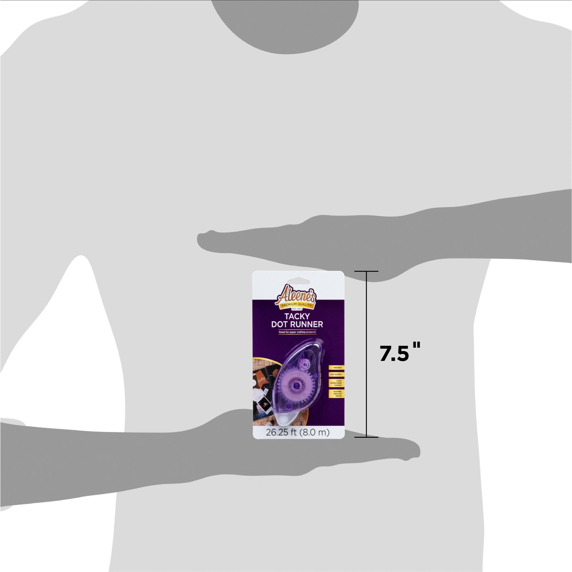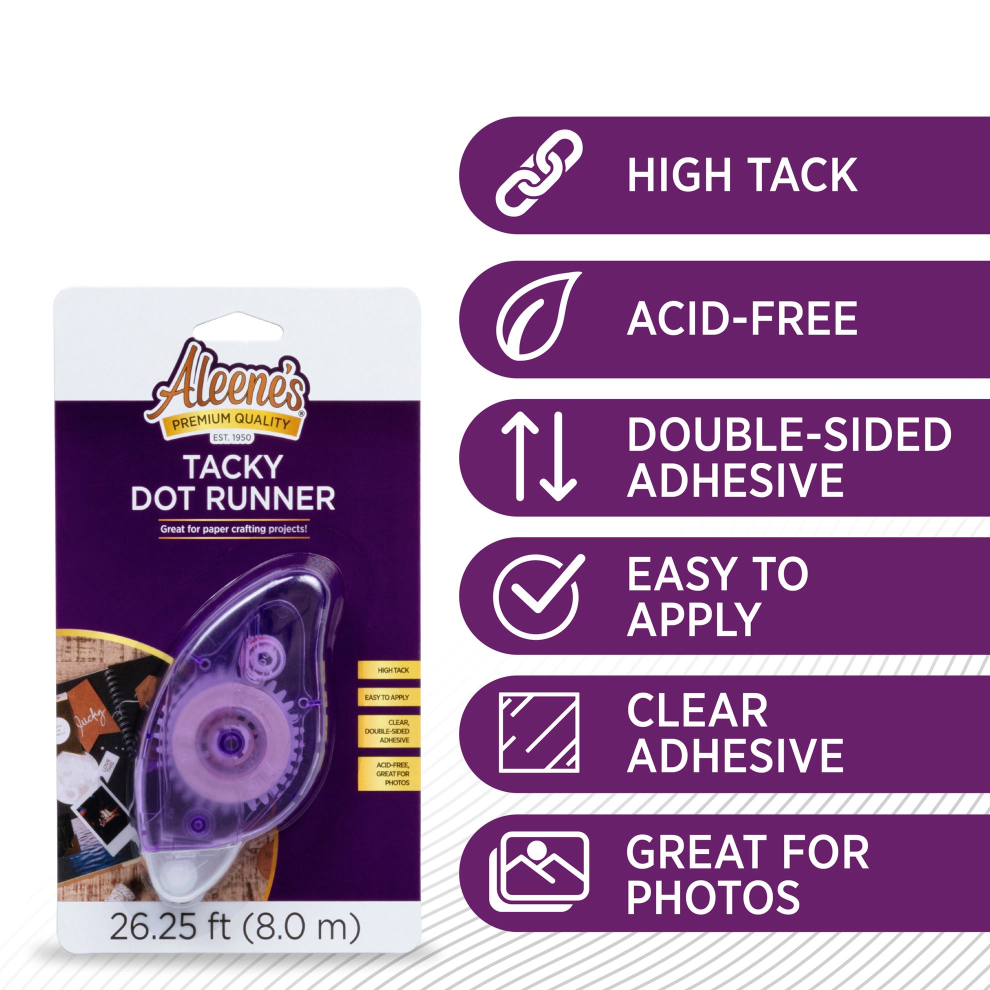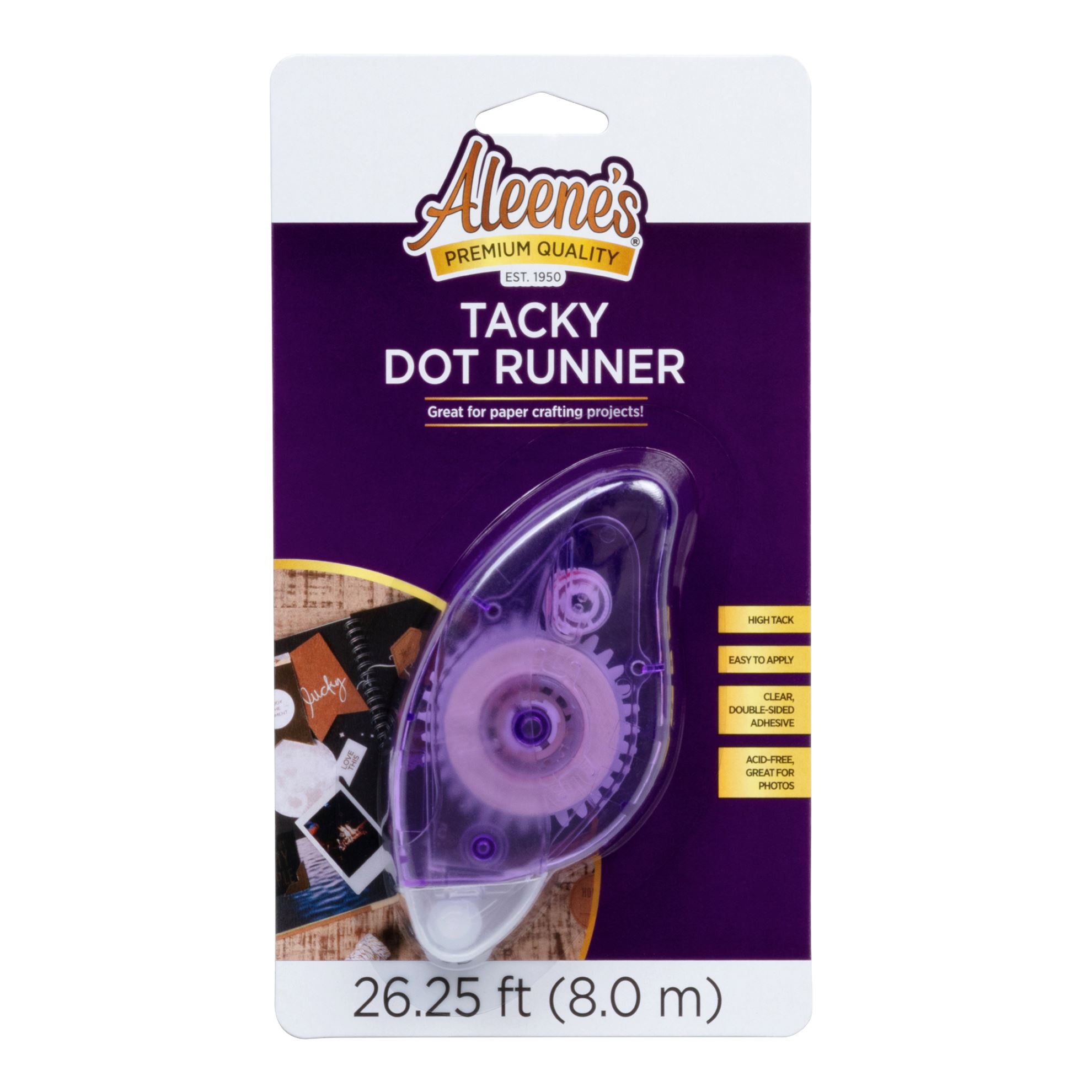 Aleene’s Tacky Dot Runner offers permanent hold in a convenient, mess-free, refillable cartridge — just pull the runner for instant tack! These double-sided adhesive dots are acid-free and great for photos, making them great for paper crafts. Refill cartridges sold separately. Includes 1 (26.25 ft) Tacky Dot Runner.