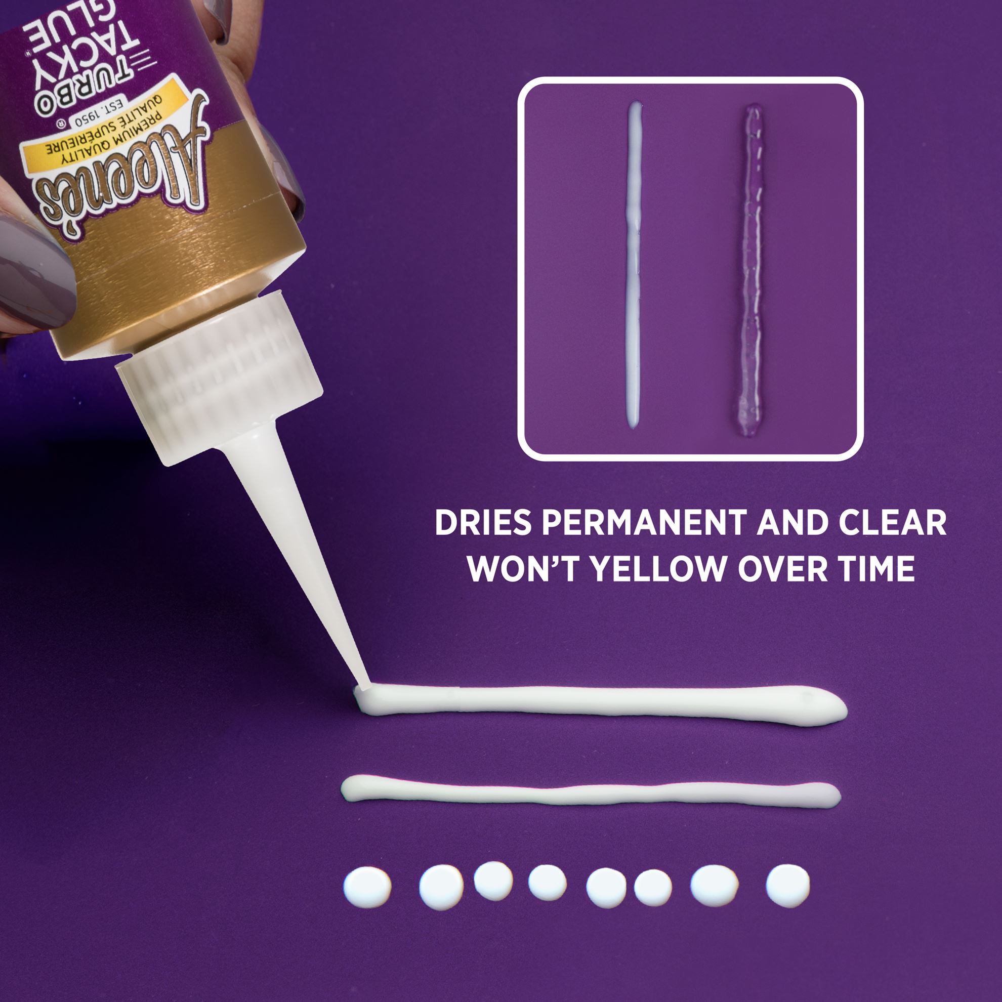 Aleene’s Turbo Tacky Glue dries faster with a stronger hold than our Original Tacky Glue! One of the most trusted all-purpose adhesives you can find, Turbo Tacky Glue works on just about every surface. Its thick, tacky formula dries clear and uses more resin for a super strong and permanent bond. Great for crafts, hobbies, DIYs and household repairs. Features 1 (4 fl. oz.) bottle of Aleene’s Turbo Tacky Glue. Needle nose applicator offers precision application.