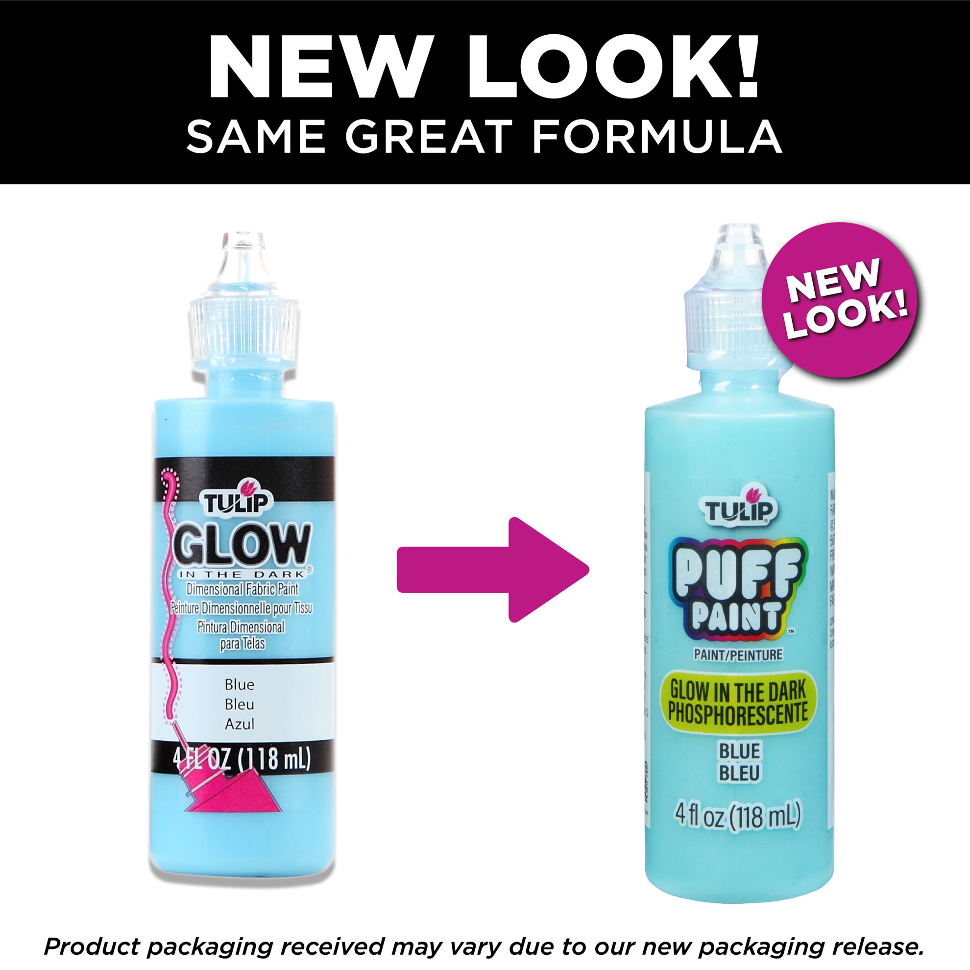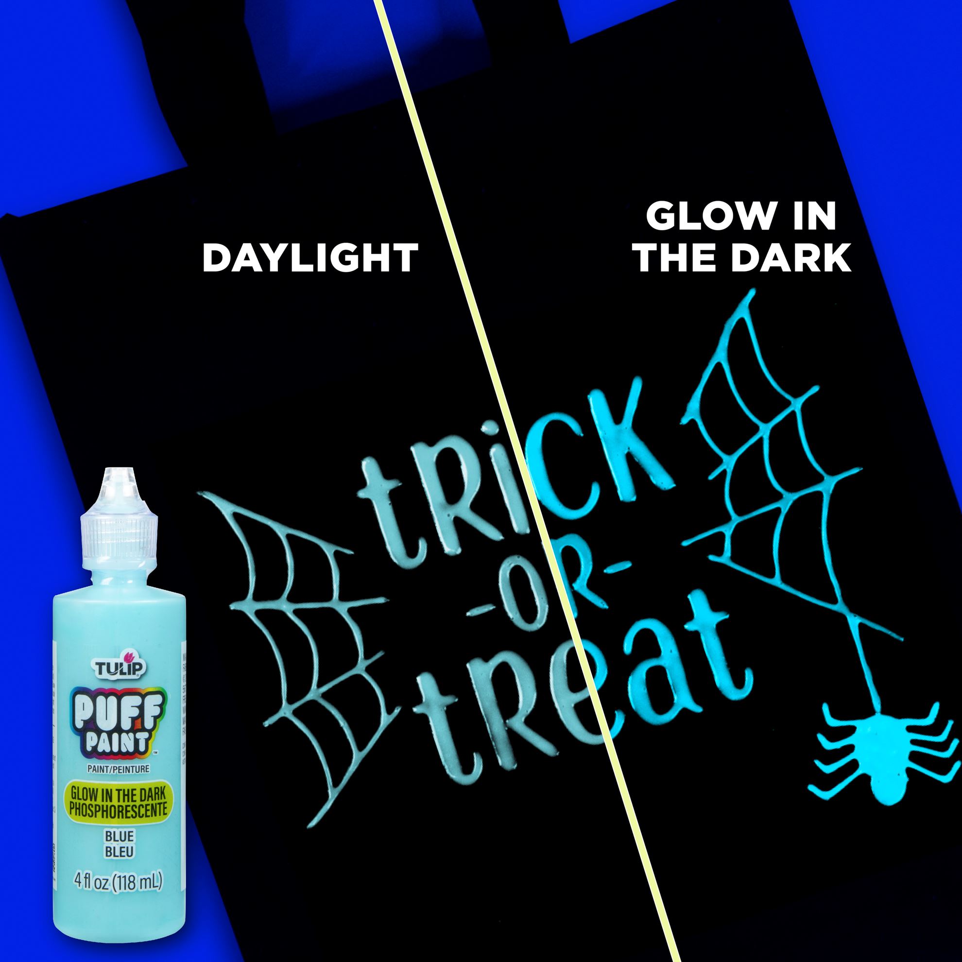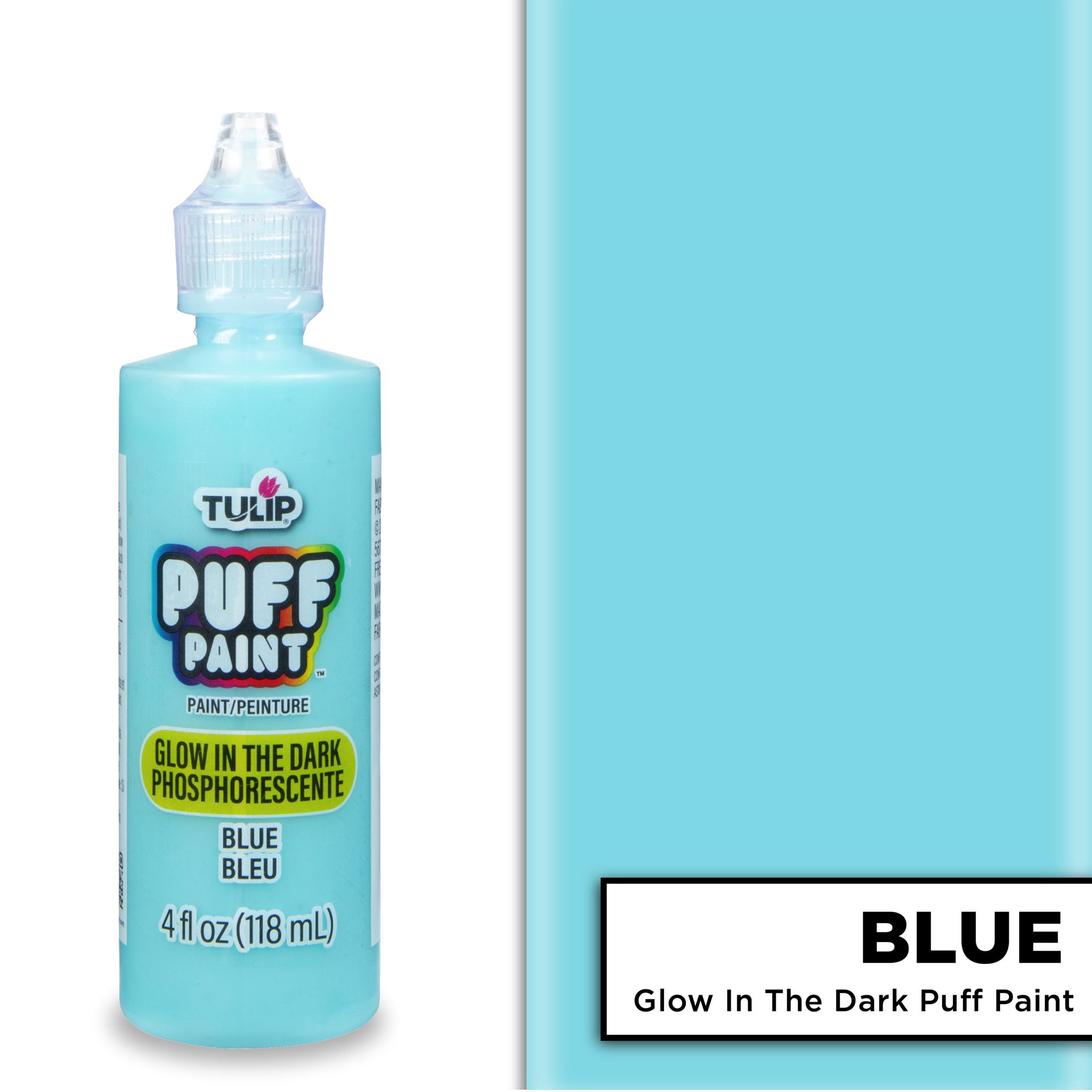 Make your craft and fashion projects stand out with Puff Paint! Tulip Puff Paints dry permanent, flexible and machine washable with glow in the dark, dimensional texture that stands out on every project. These nontoxic paints are used by crafters of all ages and skill levels on everything from educational crafts to statement T-shirts, canvas art, accessories, gift giving, seasonal décor and so much more!To activate, expose Glow Paint to UV light source, such as outdoor or black light, for at least one minute.Includes 1 (4 fl. oz) bottle of Glow in the Dark Blue Puff Paint.
