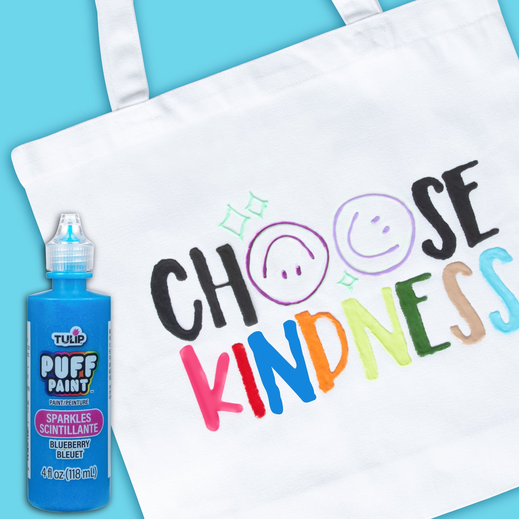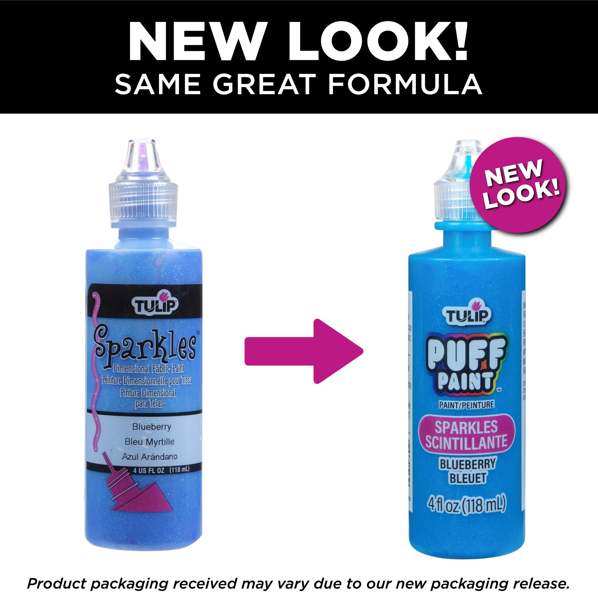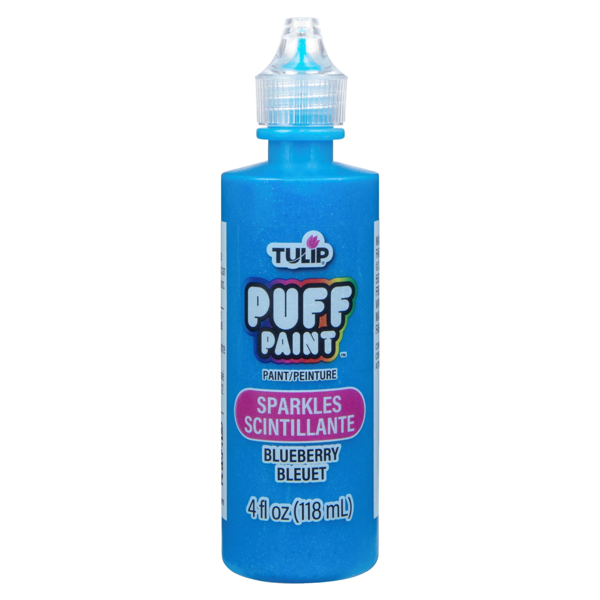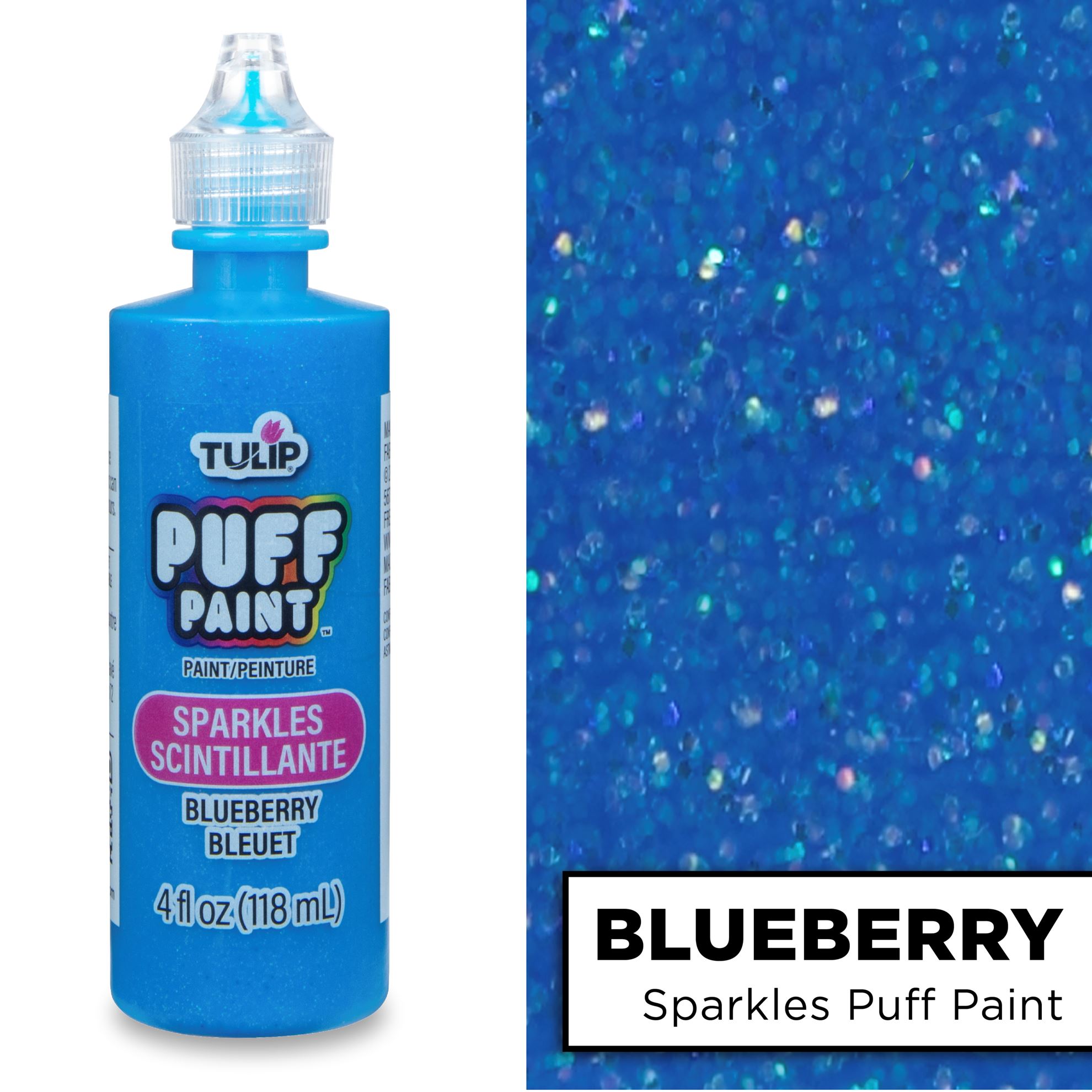 Make your craft and fashion projects stand out with Puff Paint! Tulip Puff Paints dry permanent, flexible and machine washable with sparkling, dimensional texture that stands out on every project. These nontoxic paints are used by crafters of all ages and skill levels on everything from educational crafts to statement T-shirts, canvas art, accessories, gift giving, seasonal décor and so much more!Includes 1 (4 fl. oz) bottle of Sparkles Blueberry Puff Paint.