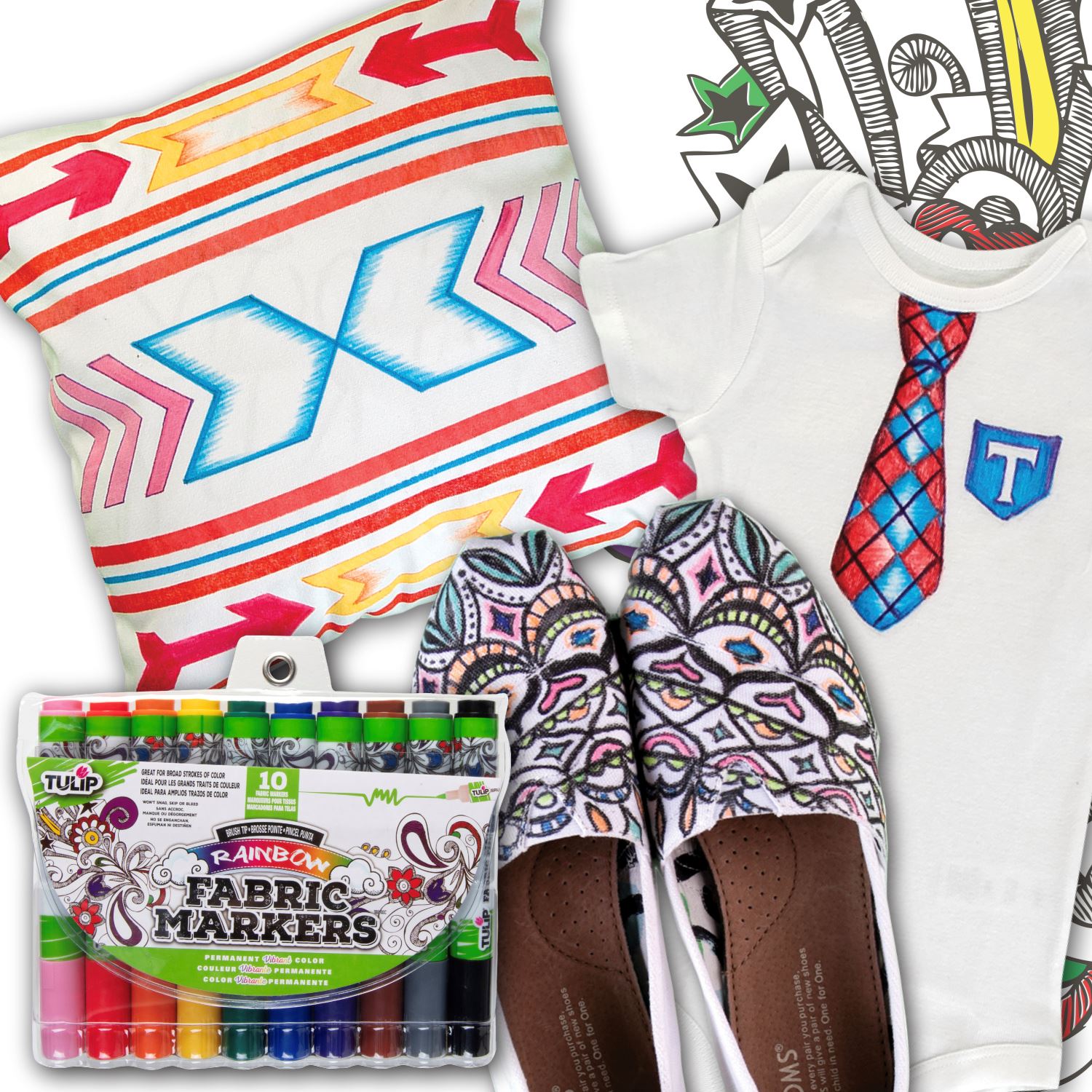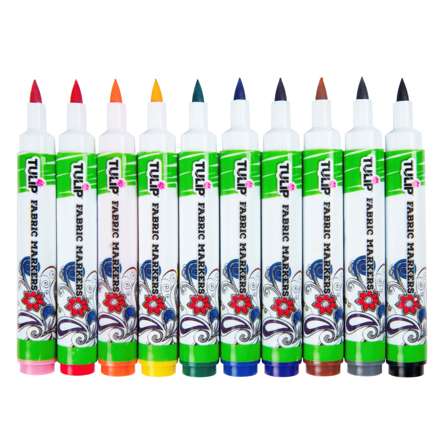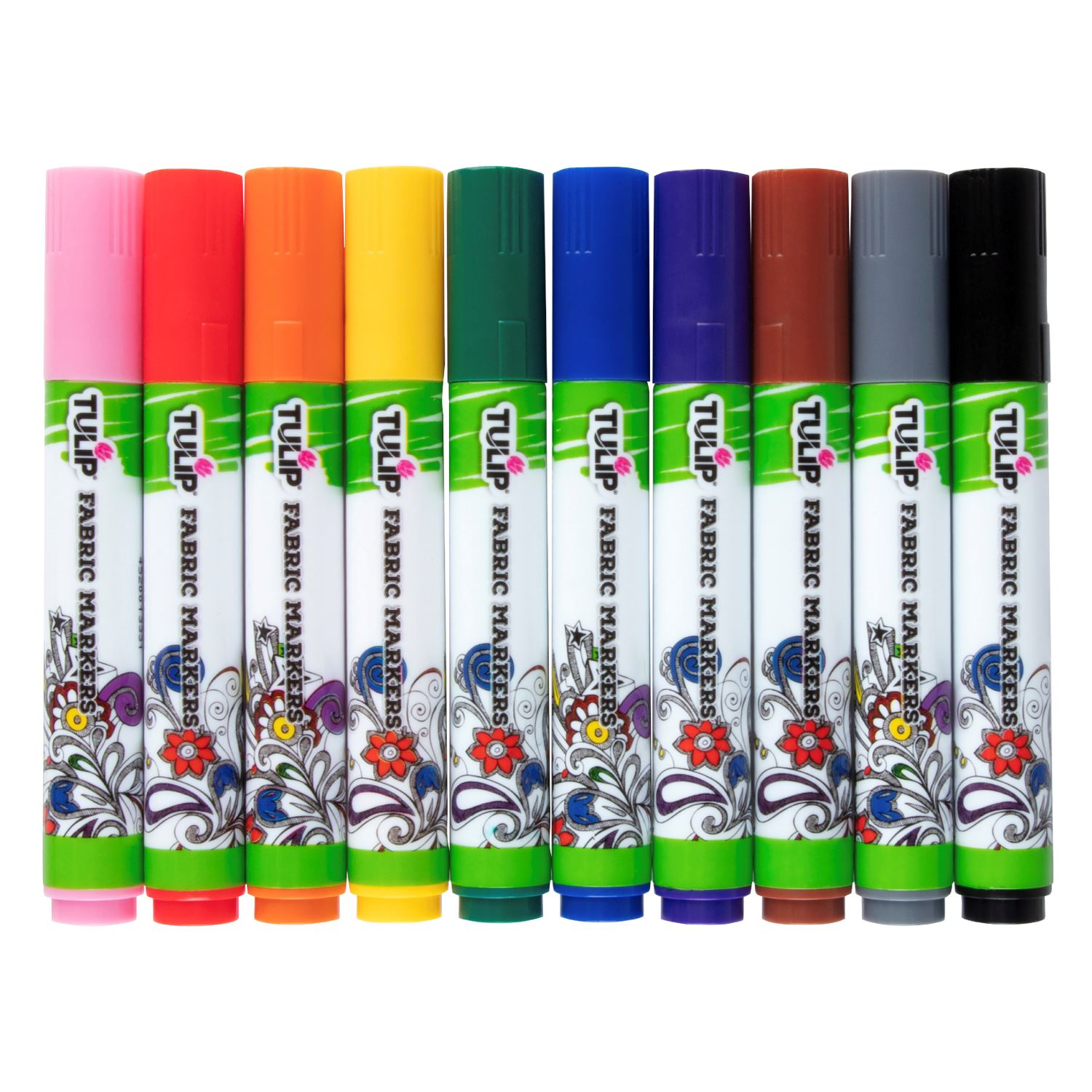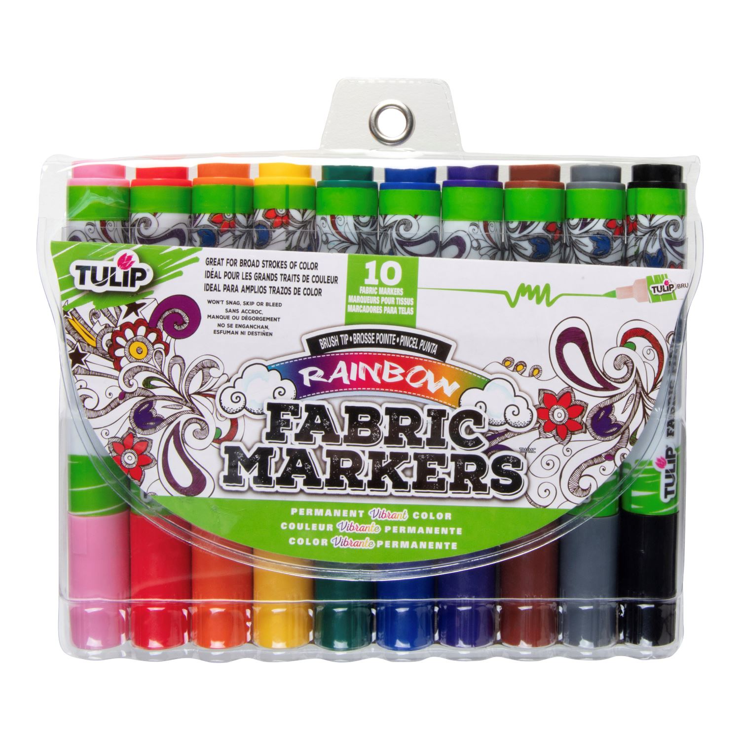 Give your fabrics a boost of color with Tulip Fabric Markers! This Rainbow 10 Pack includes brush-tip markers (Pink, Red, Orange, Yellow, Green, Blue, Purple, Brown, Gray, Black) that are perfect for broad coverage and writing on fabrics. Tulip Fabric Markers dry permanently, so let your imagination take over on a variety of DIY craft surfaces!