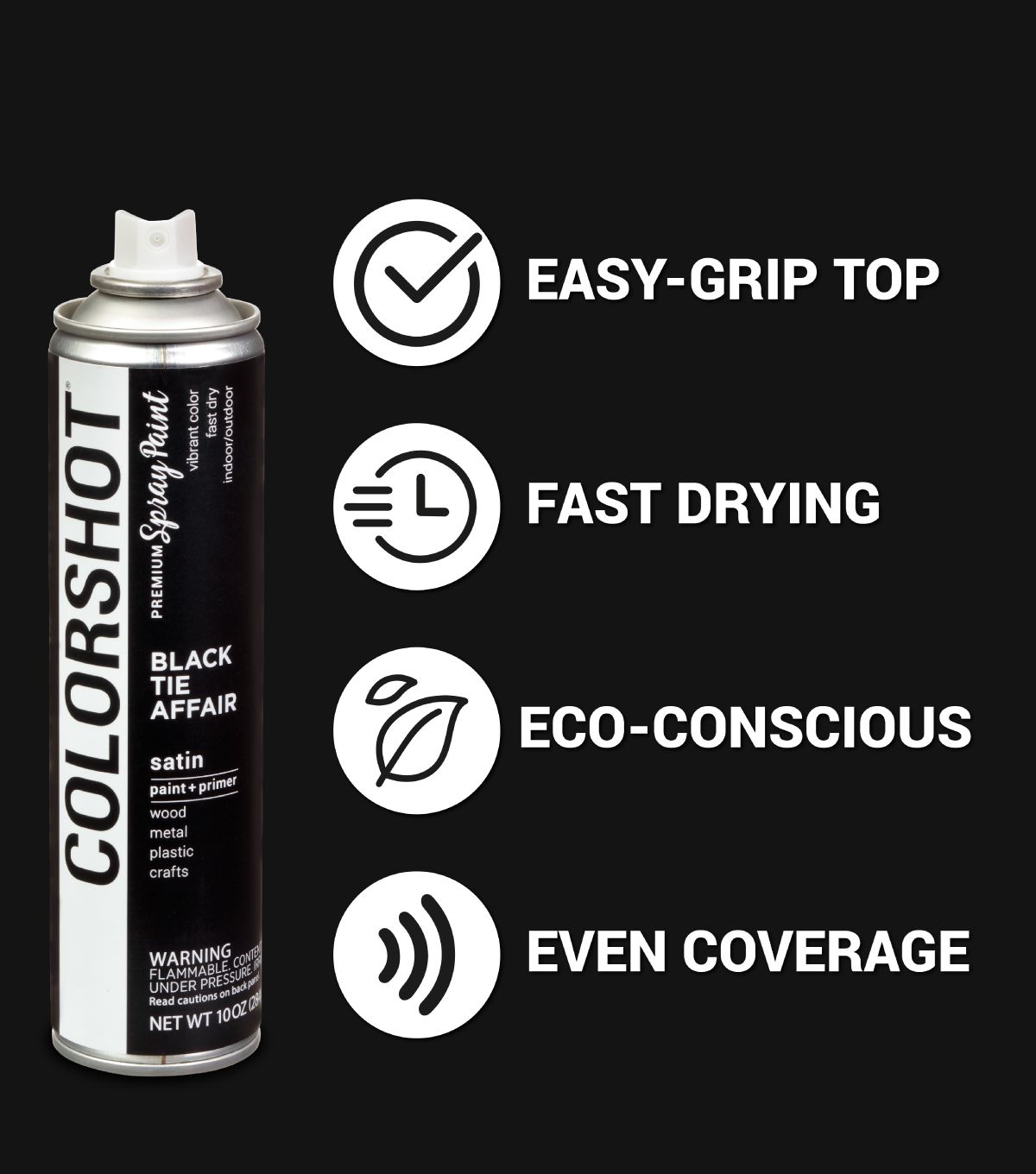 COLORSHOT Premium Spray Paint is designed to be everything regular spray paint isn’t. From the must-have selection of head-turning colors to the hardworking acrylic paint formula and sleek can design, no other spray paint allows you to play with color the way COLORSHOT does. Even better, the innovative COLORSHOT formula has a propellant made from sugar cane instead of petroleum, so you can feel good about the sweet decision to turn everything in your house a shade of Black Tie Affair. All the color you need for a brand-new look, powered by COLORSHOT.