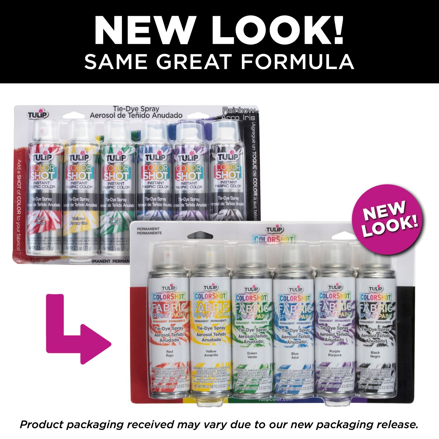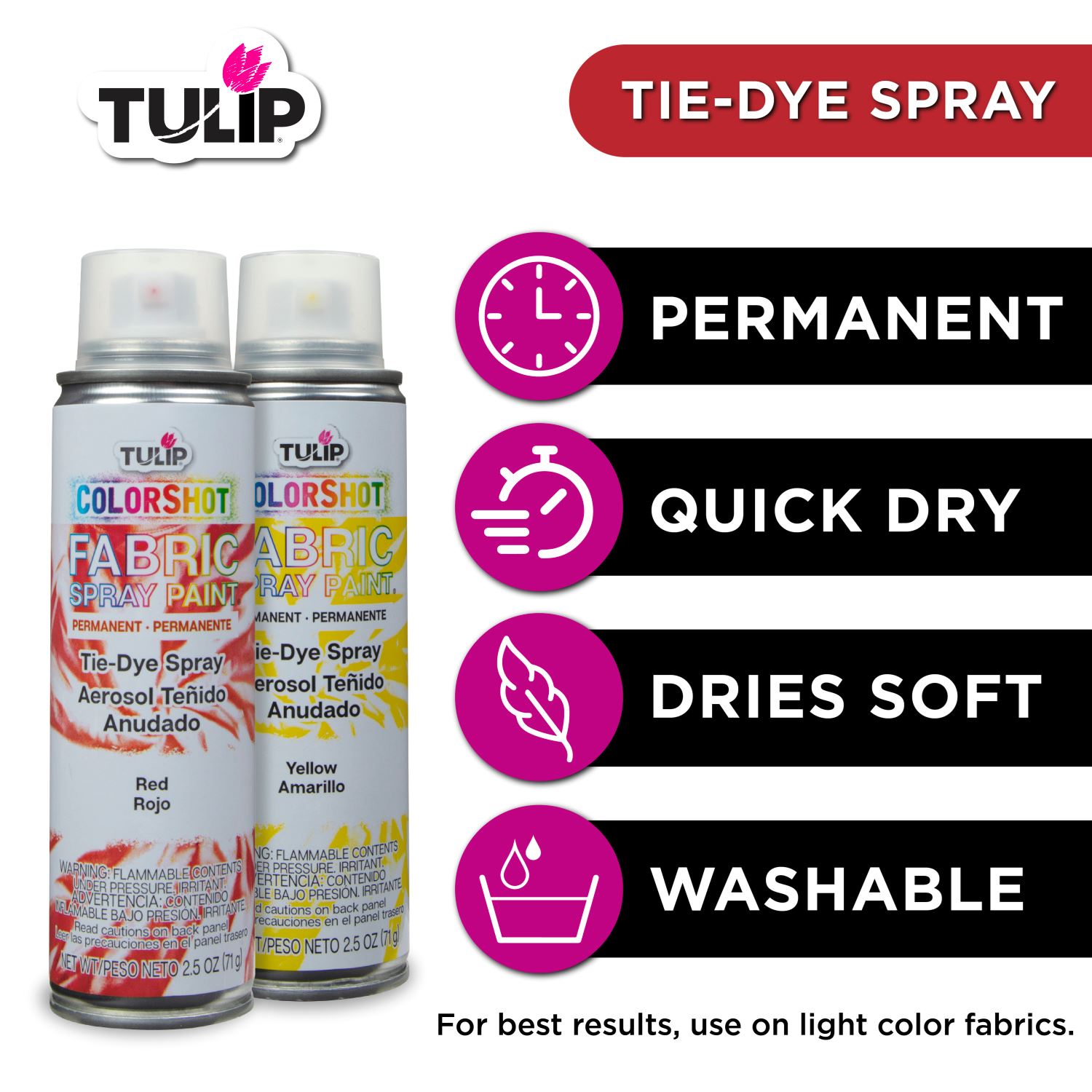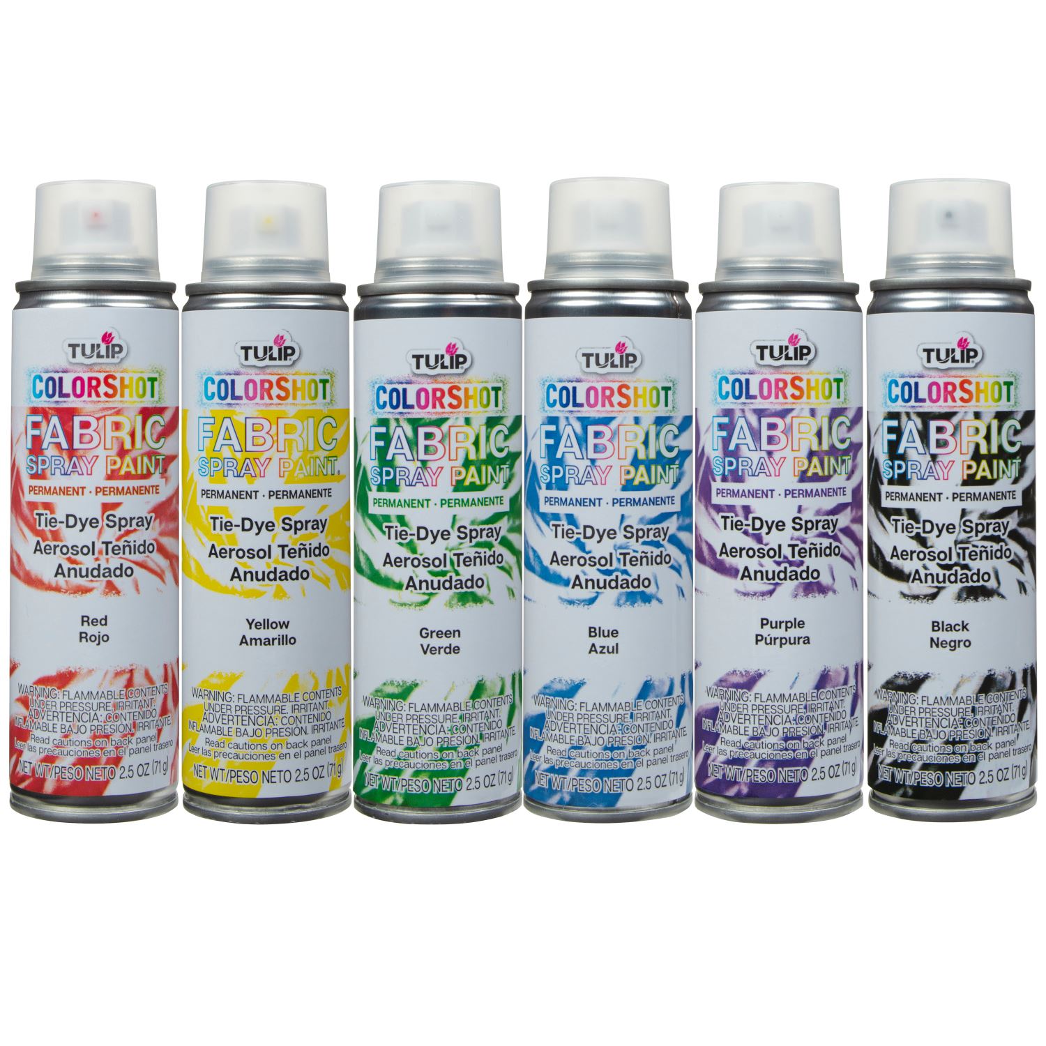 - Aerosol fabric spray available in a pack of 2.5-oz. spray cans - includes 6 bright rainbow colors!