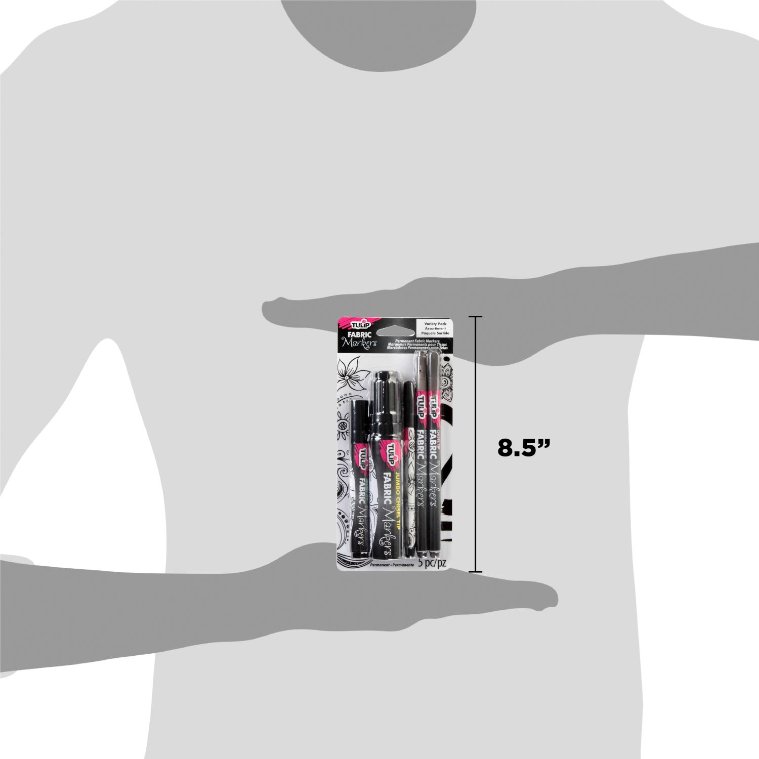 Give your fabrics a boost of color with Tulip Fabric Markers This Black Variety 5 Pack includes a brush tip, fine tip, extra fine tip, chisel tip, and jumbo chisel tip markers that are perfect for drawing on fabrics. Tulip Fabric Markers dry permanently on light-colored fabrics, so let your imagination take over on clothing, shoes, bags & backpacks, and other DIY craft surfaces! The bright and bold premium-color inks keep your creativity from fading, even after multiple machine washes. No heat-setting required.