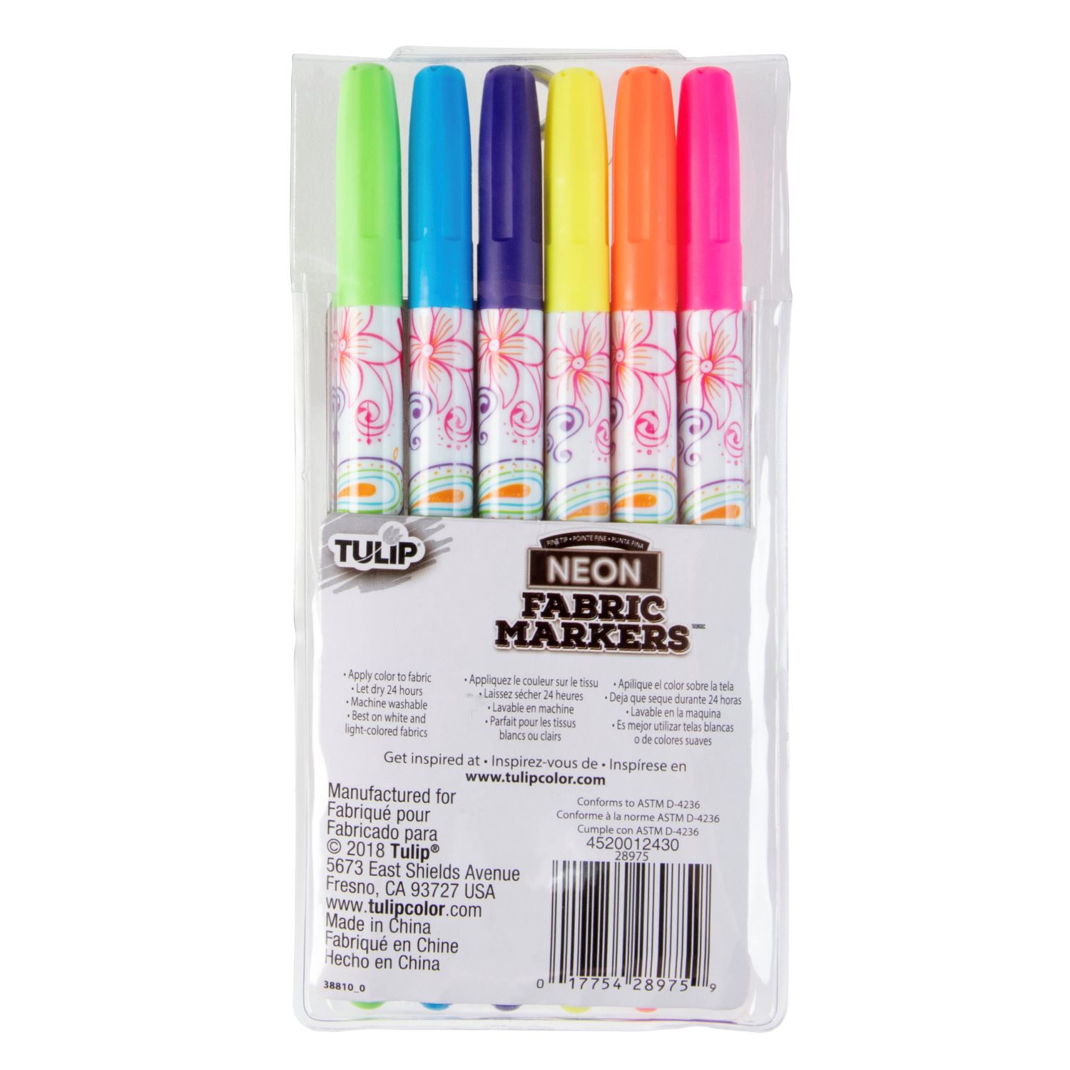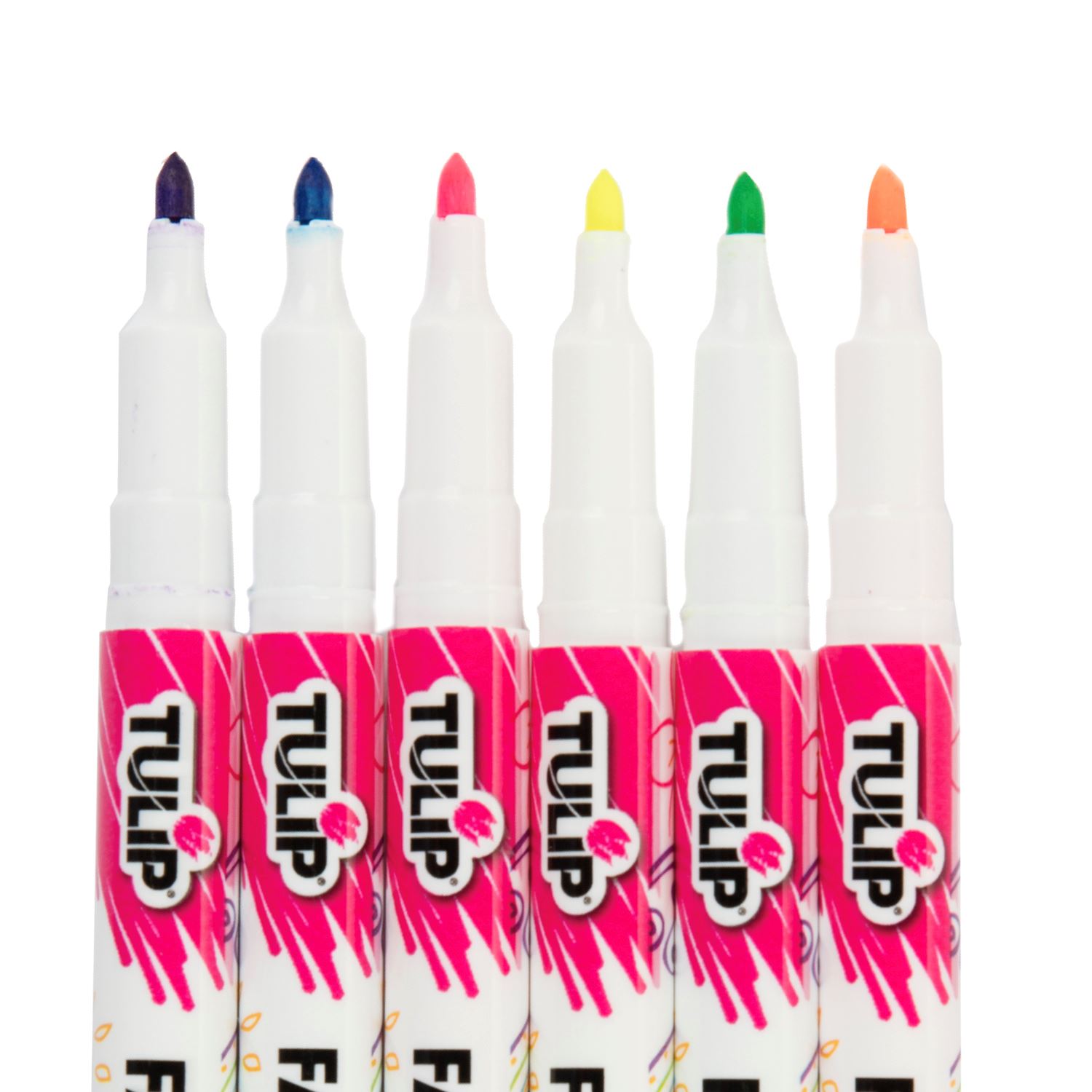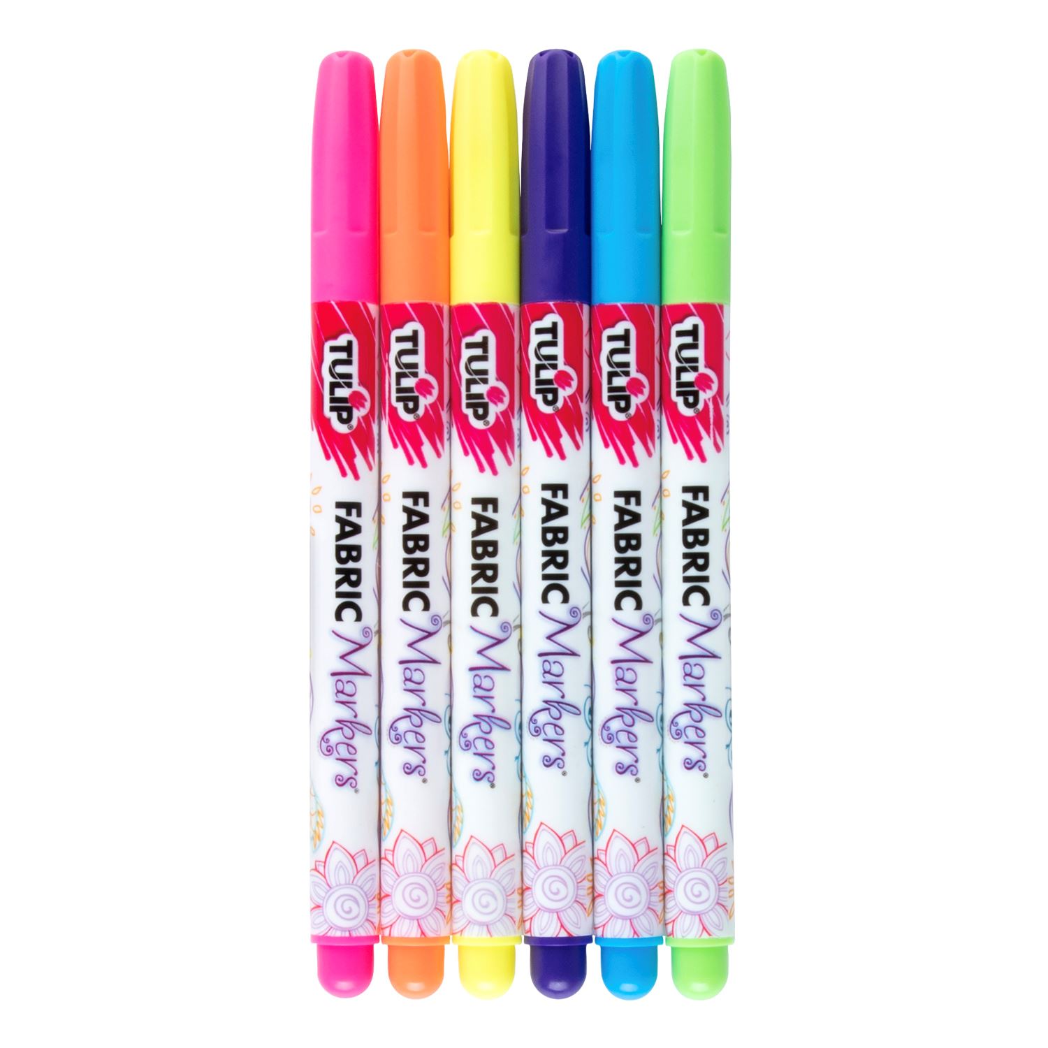 Give your fabrics a boost of color with Tulip Fabric Markers! This Neon 6 Pack includes fine-tip markers (Pink, Orange, Yellow, Green, Blue, Purple) that are perfect for doodling, outlining, and writing on fabrics. Tulip Fabric Markers dry permanently, so let your imagination take over on a variety of DIY craft surfaces!