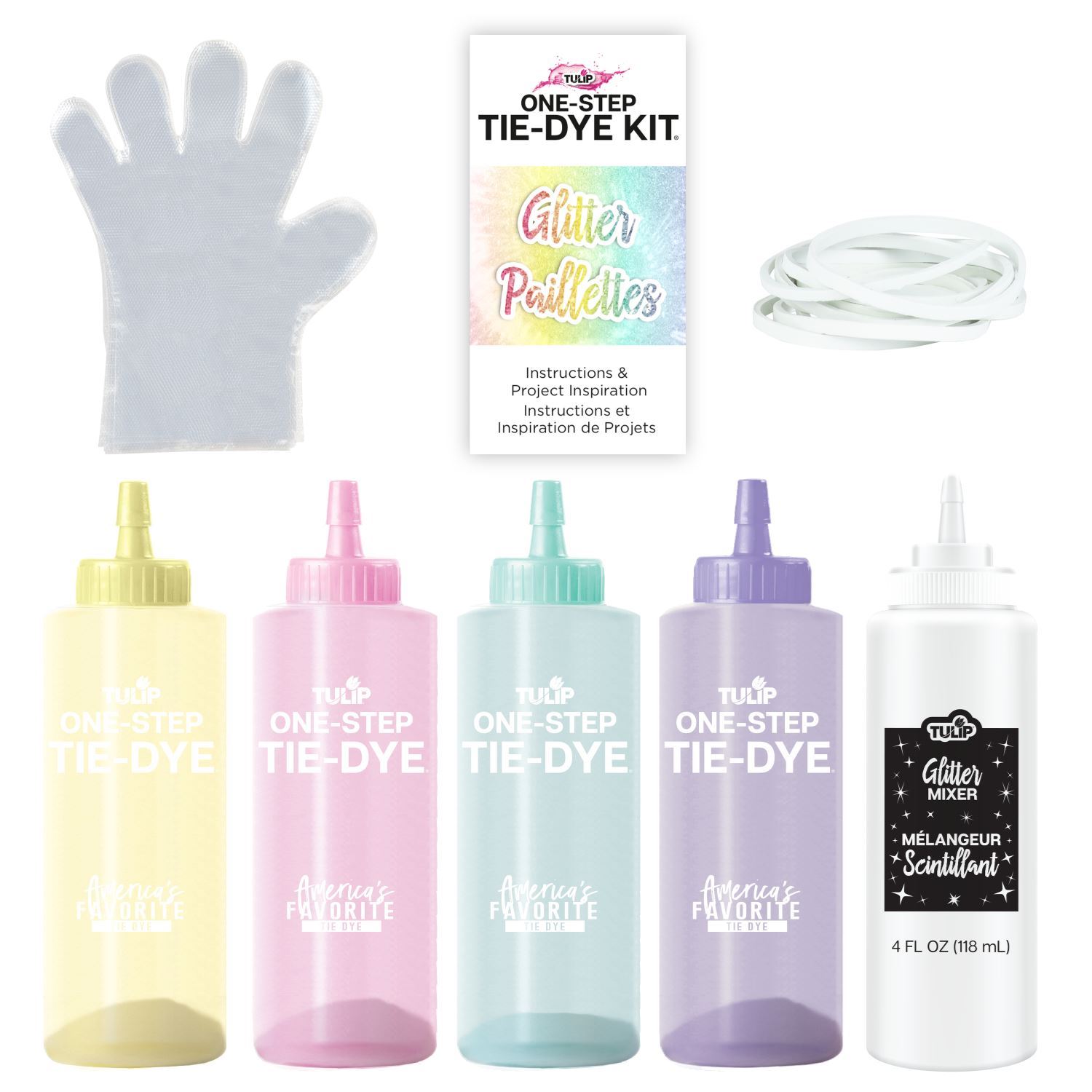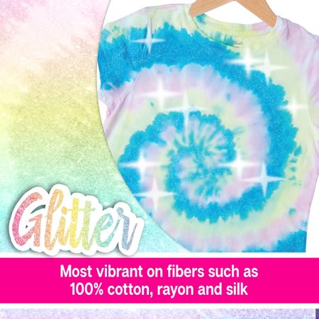 Make your tie-dye projects sparkle & shine with the Tulip® Glitter One-Step Tie-Dye Kit®! This unique, easy-to-use tie-dye kit comes with the tools and special instructions you need for your colorful glitter tie-dye experience. Stocked with 4 bottles of vibrant coordinating One-Step Dyes (blush, lemon, mint and lavender) and a special Glitter Mixer to add to your dyes, plus rubber bands, gloves, and a glitter tie-dye instruction & inspiration guide. This kit is ready to add sparkling color to your wardrobe with shimmering designs you can mix & match with each other and your other tie-dye creations.