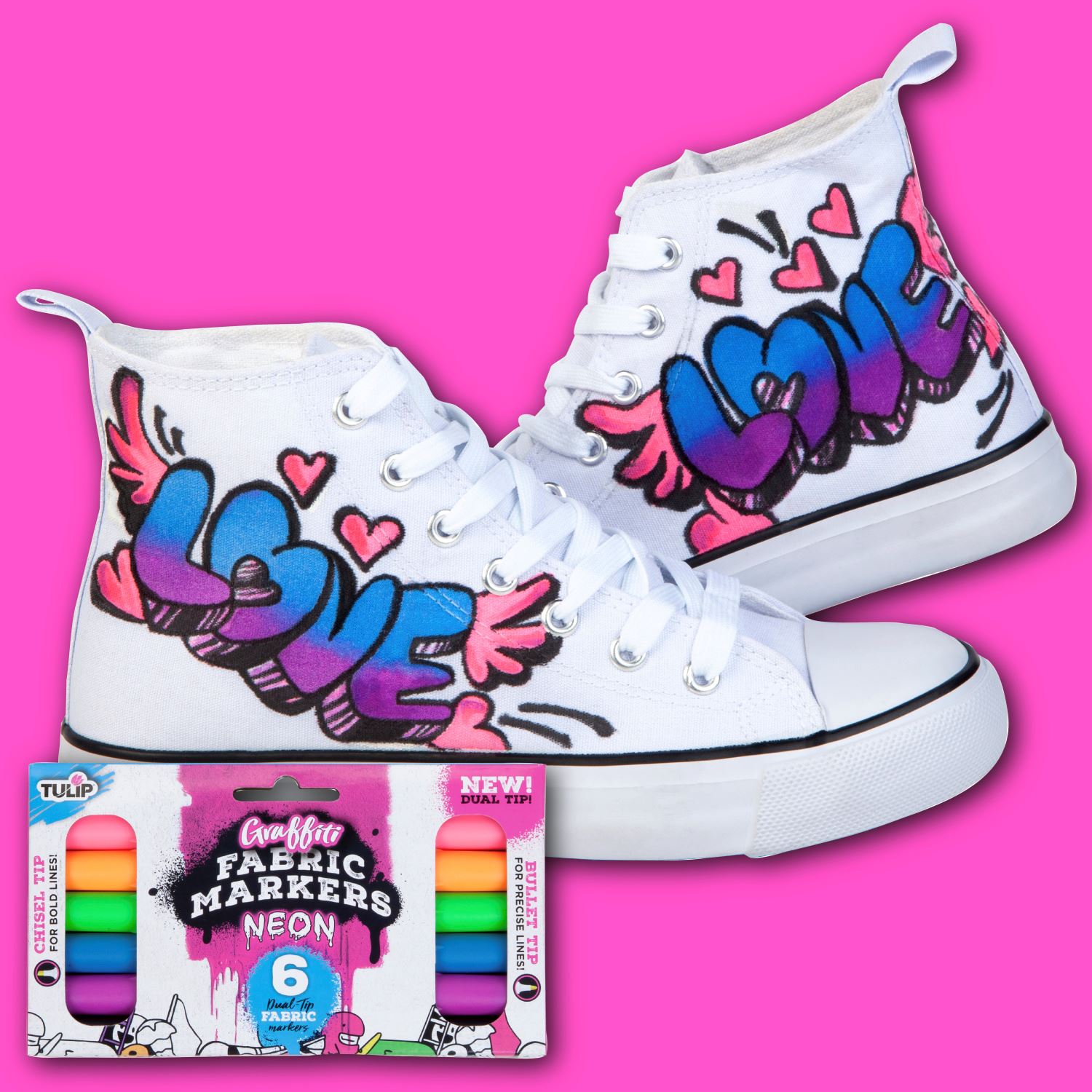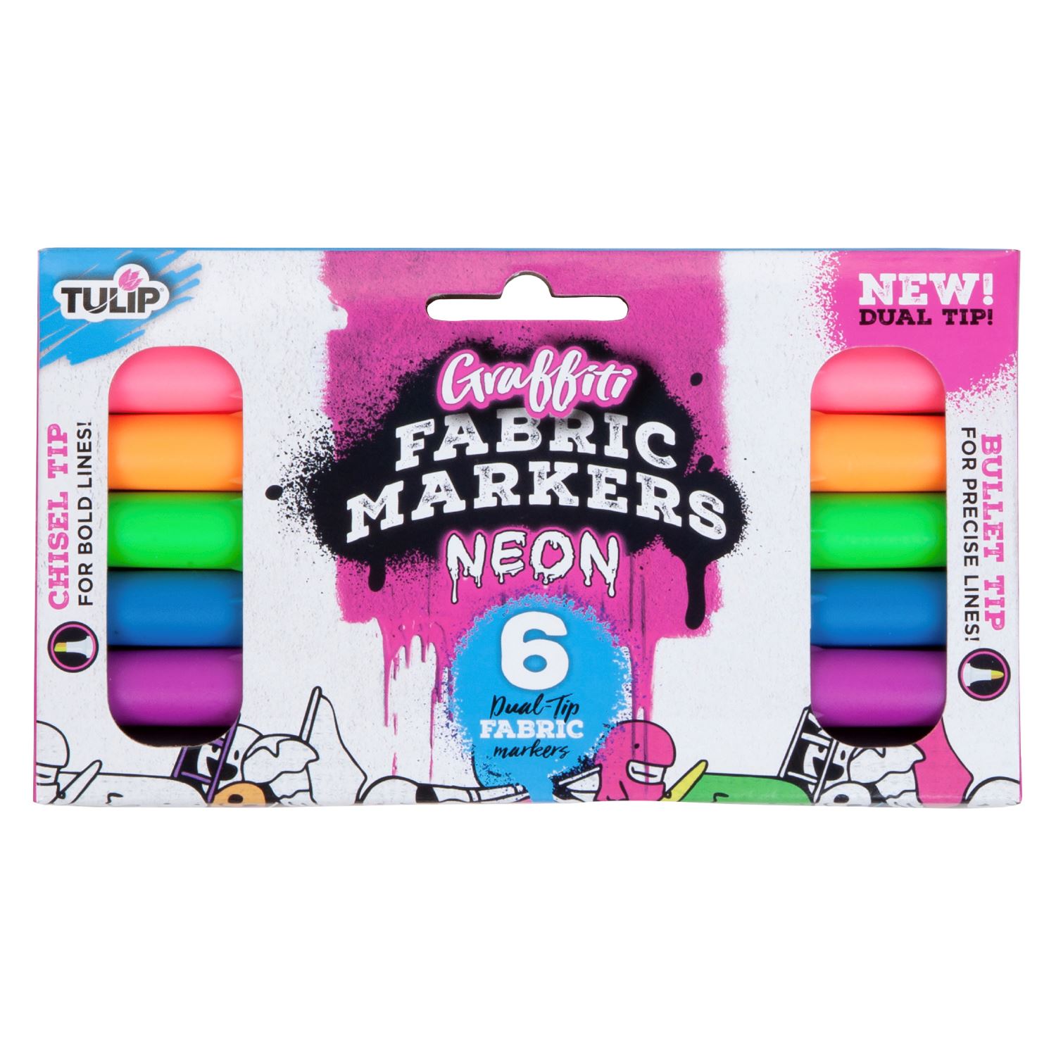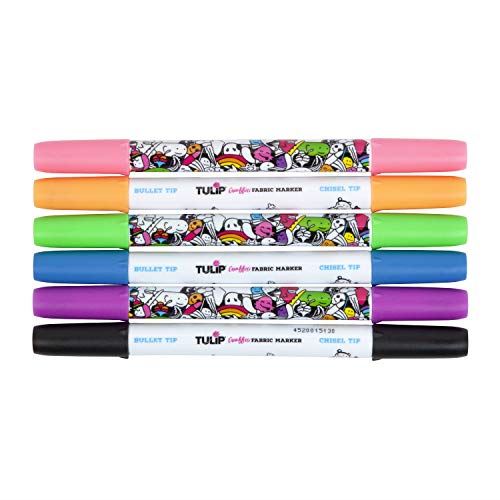 Tulip Graffiti Fabric Markers kick your creativity into high gear with poppin’ color! This Neon 6 Pack includes dual-tip markers (Pink, Orange, Green, Light Blue, Purple, Black) with bullet and chisel tips for versatile drawing and writing on fabrics. Tulip Fabric Markers dry permanently on light-colored fabrics, so let your imagination take over on clothing, shoes, bags & backpacks, and other DIY craft surfaces! The bright and bold premium-color inks keep your creativity from fading, even after multiple machine washes. No heat-setting required.