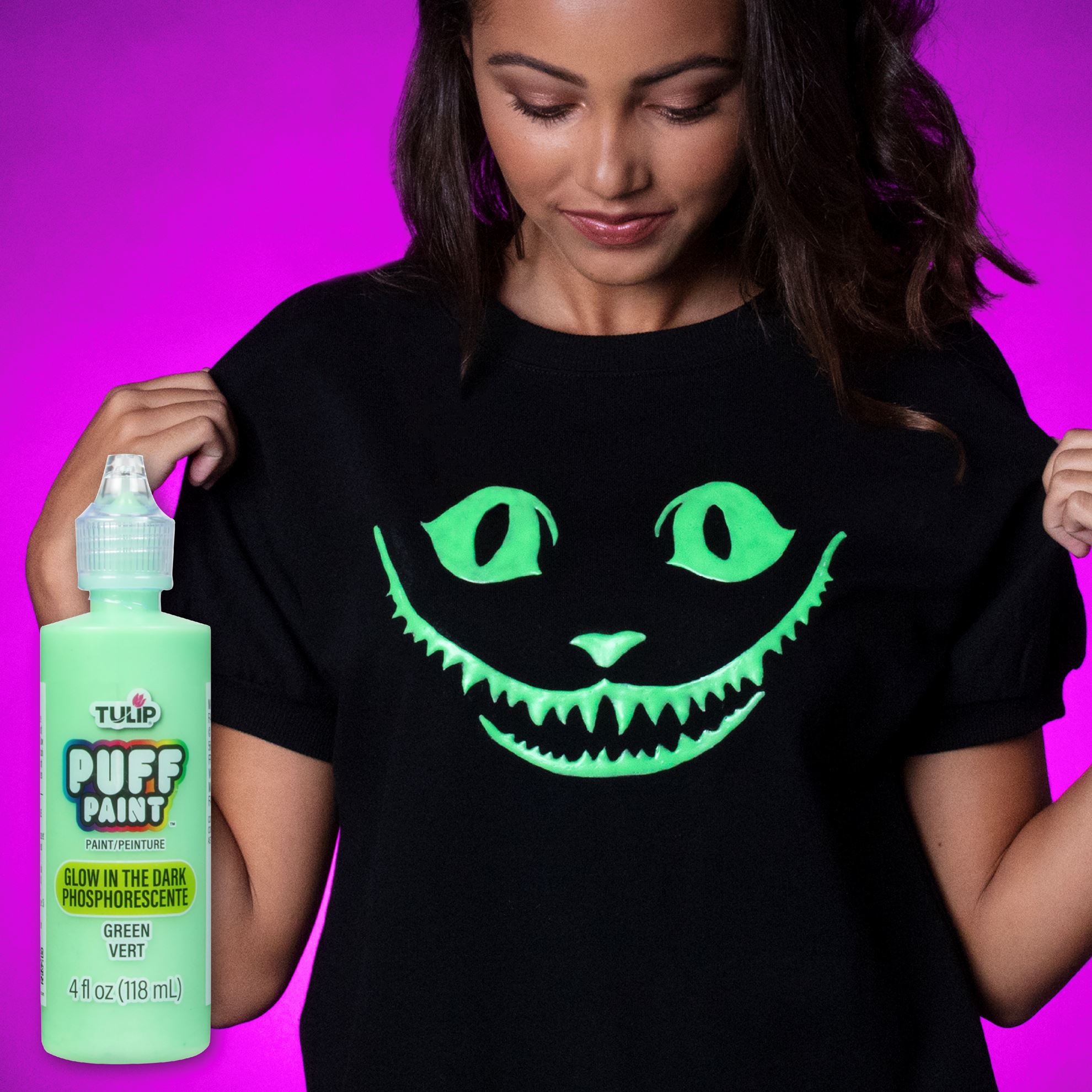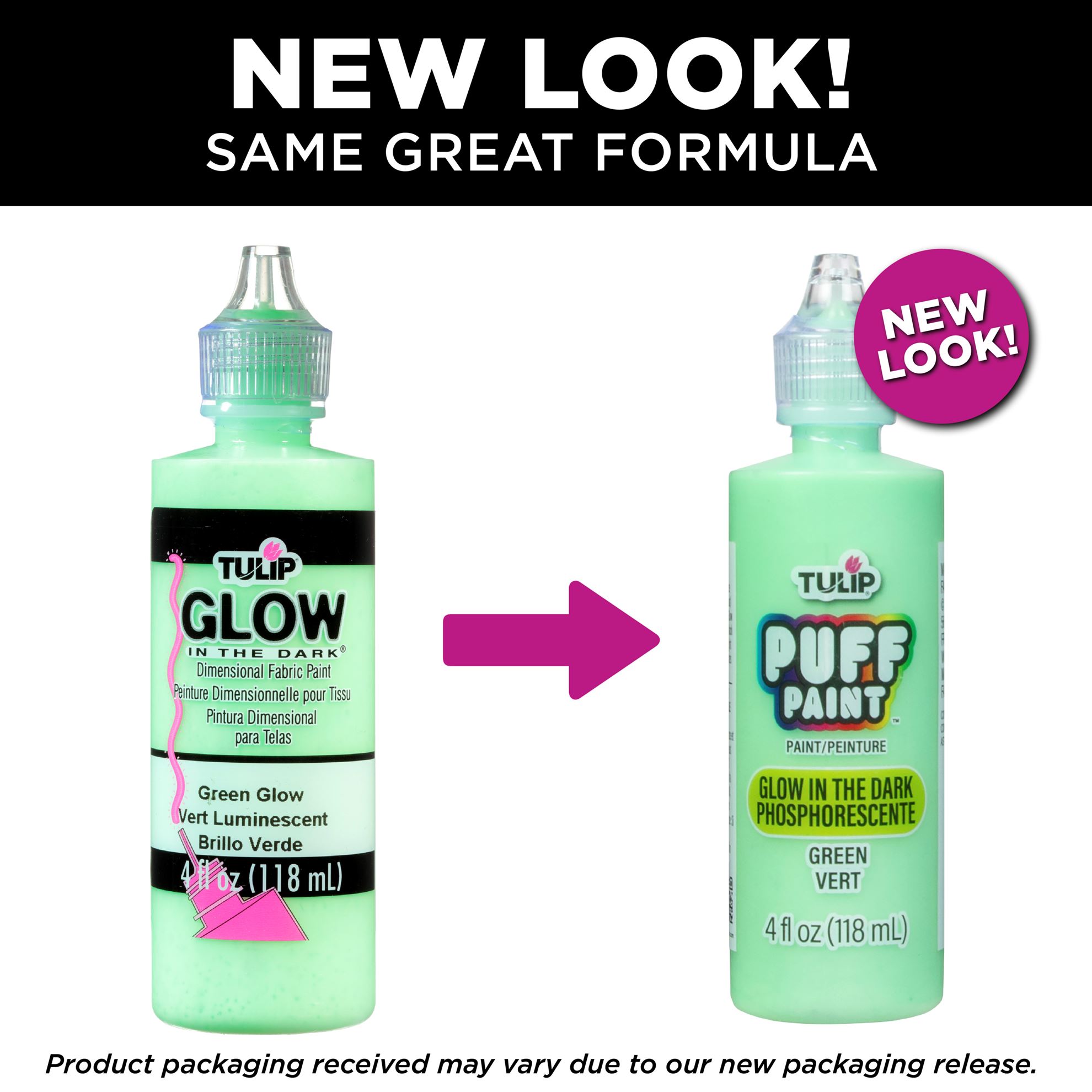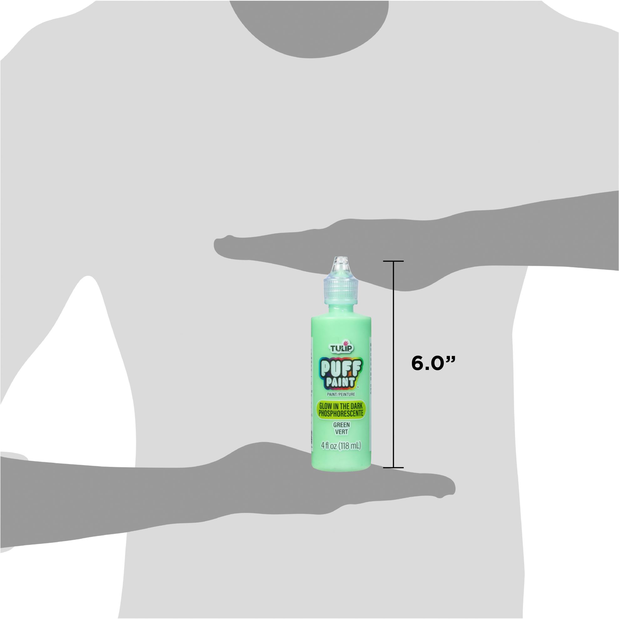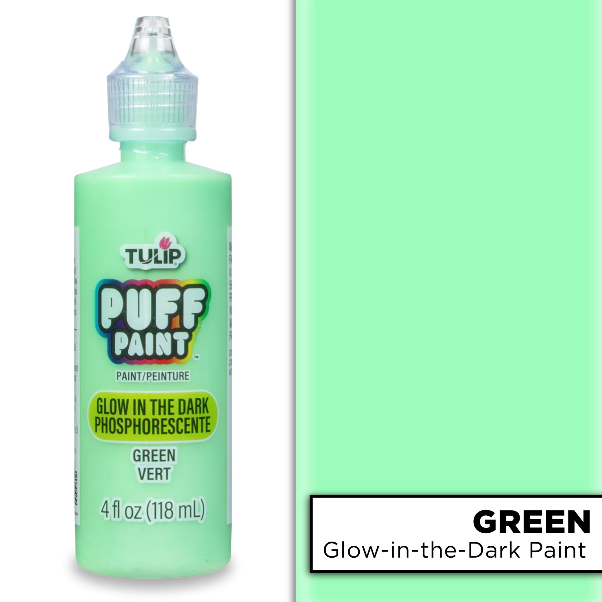 Make your craft and fashion projects stand out with Puff Paint! Tulip Puff Paints dry permanent, flexible and machine washable with glow in the dark, dimensional texture that stands out on every project. These nontoxic paints are used by crafters of all ages and skill levels on everything from educational crafts to statement T-shirts, canvas art, accessories, gift giving, seasonal décor and so much more!To activate, expose Glow Paint to UV light source, such as outdoor or black light, for at least one minute.Includes 1 (4 fl. oz) bottle of Glow in the Dark Green Puff Paint.