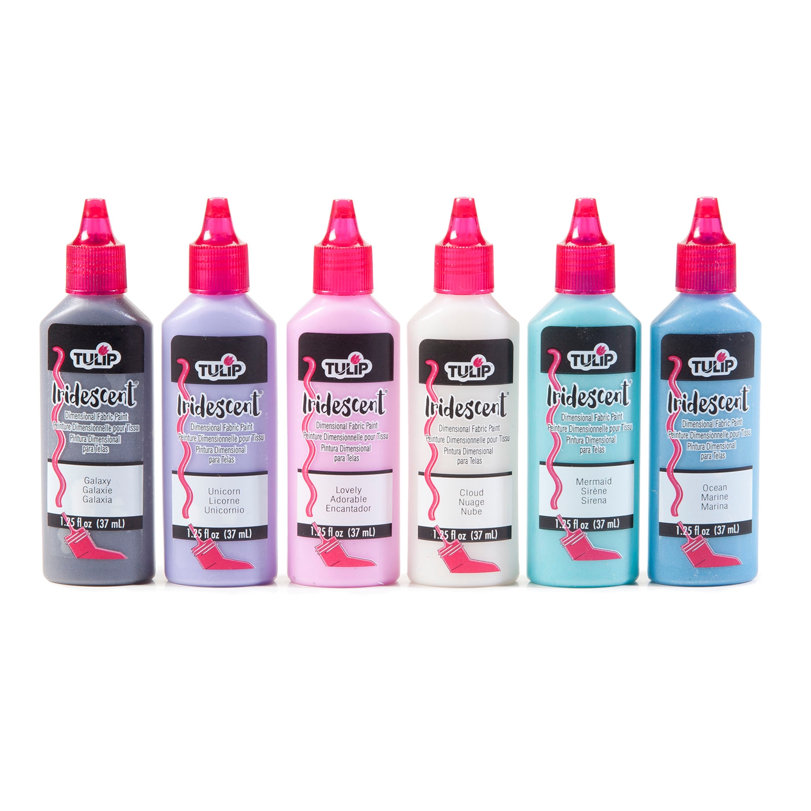 The Tulip Dimensional Fabric Paint Iridescent Pack features 6 nontoxic paints in a must-have collection of pastel colors that dry with a shimmery finish. Create your own doodles and designs that take clothes, backpacks and school projects to the next level with cool 3D effects. Paints dry permanent and won’t crack or peel, even if you throw them in the washing machine.