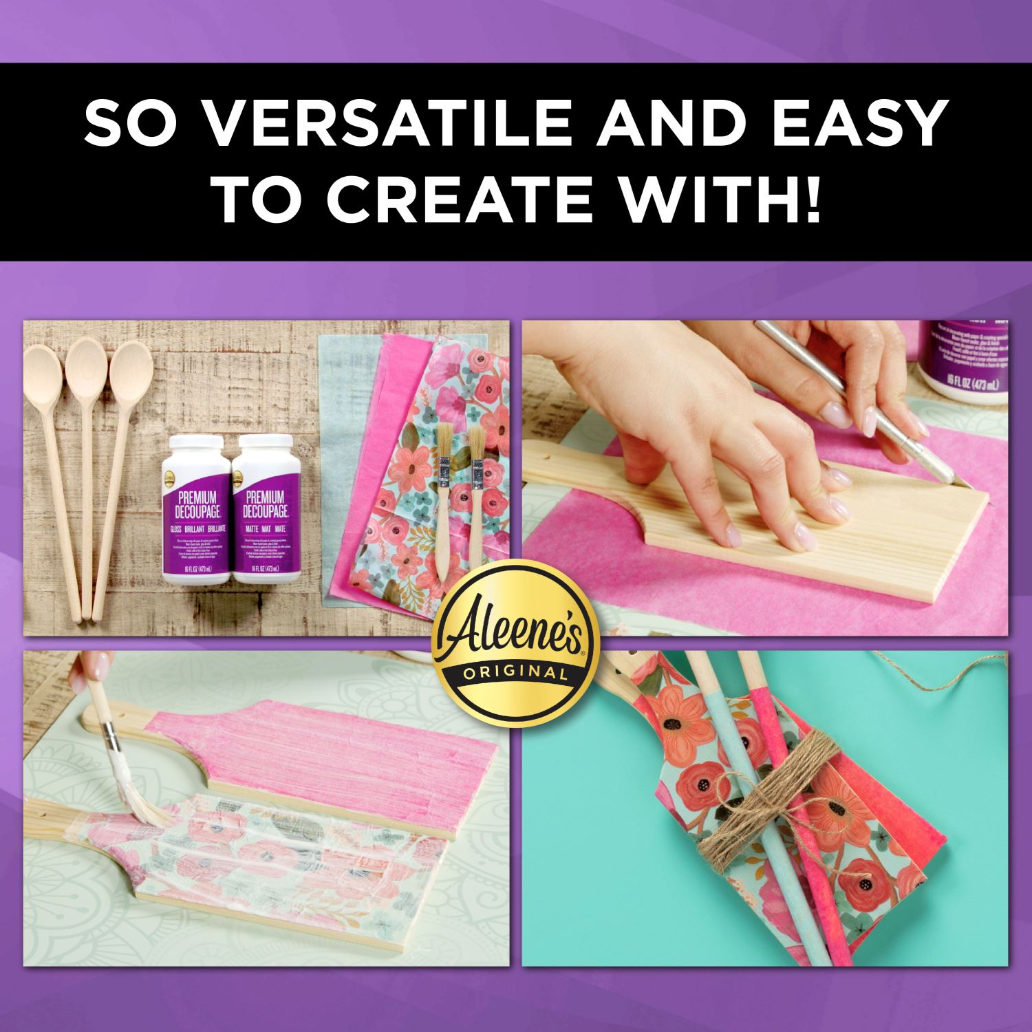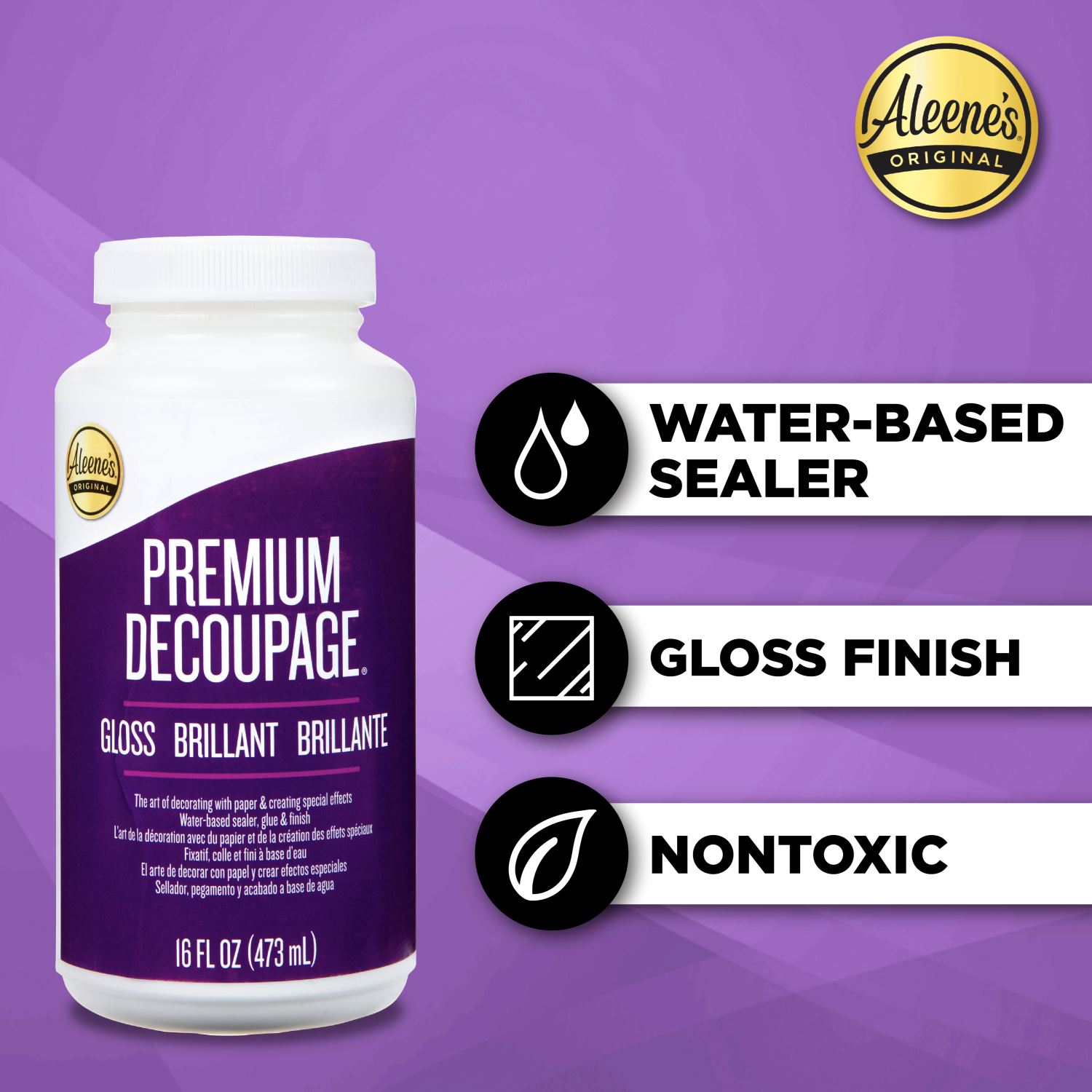 Aleene's Premium Decoupage is a water-based sealer, adhesive and finish all in one! This nontoxic decoupage can be used on an assortment of surfaces, such as paper, wood, fabric and more. Easy cleanup with water before drying, and dries with a glossy finish. Features 1 (16 fl. oz) tub of Aleene’s Premium Decoupage Gloss.