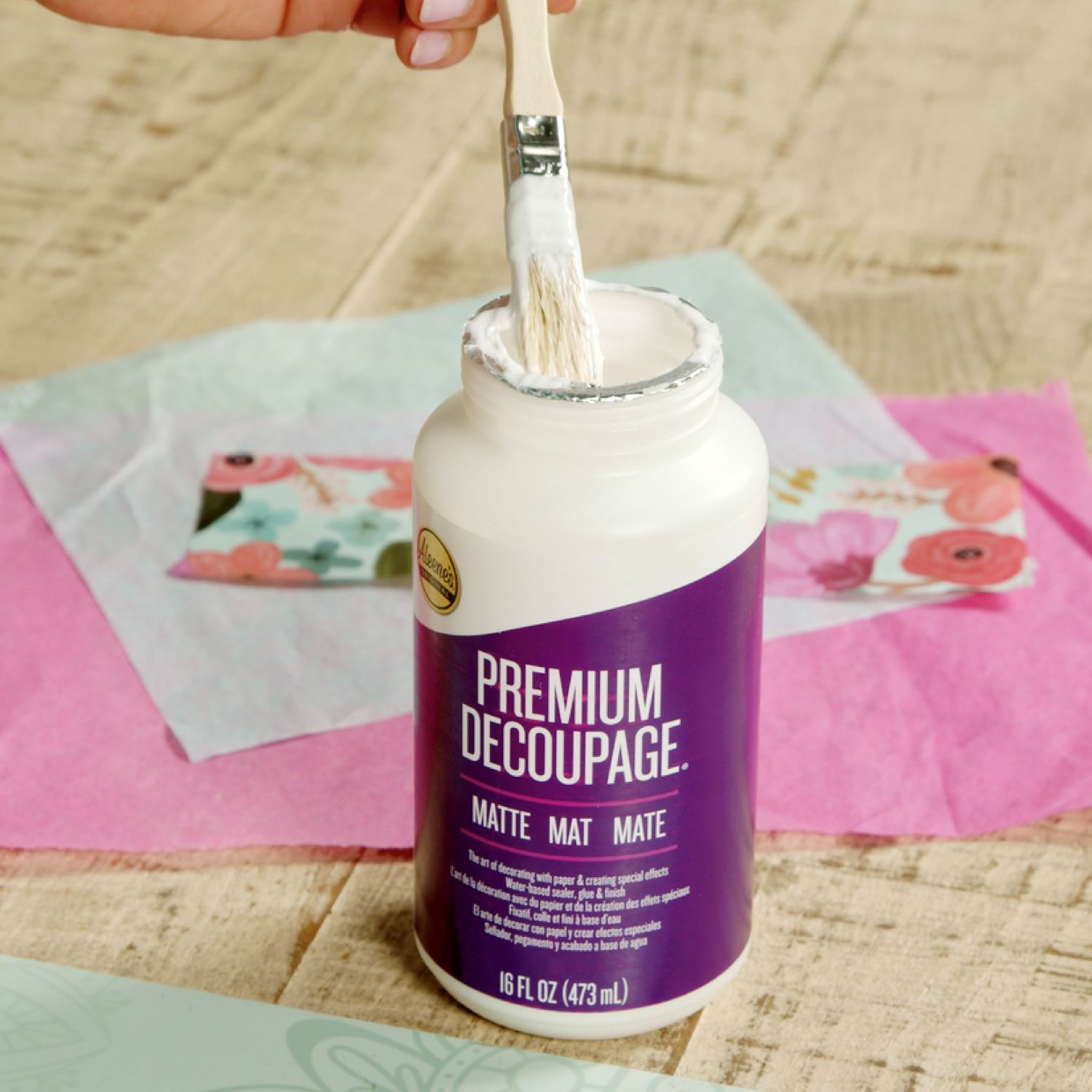 Aleene's Premium Decoupage is a water-based sealer, adhesive and finish all in one! This decoupage can be used on an assortment of surfaces, such as paper, wood, fabric and more. Easy cleanup with water before drying, and dries with a matte finish. Features 1 (16 fl. oz) tub of Aleene’s Premium Decoupage Matte.