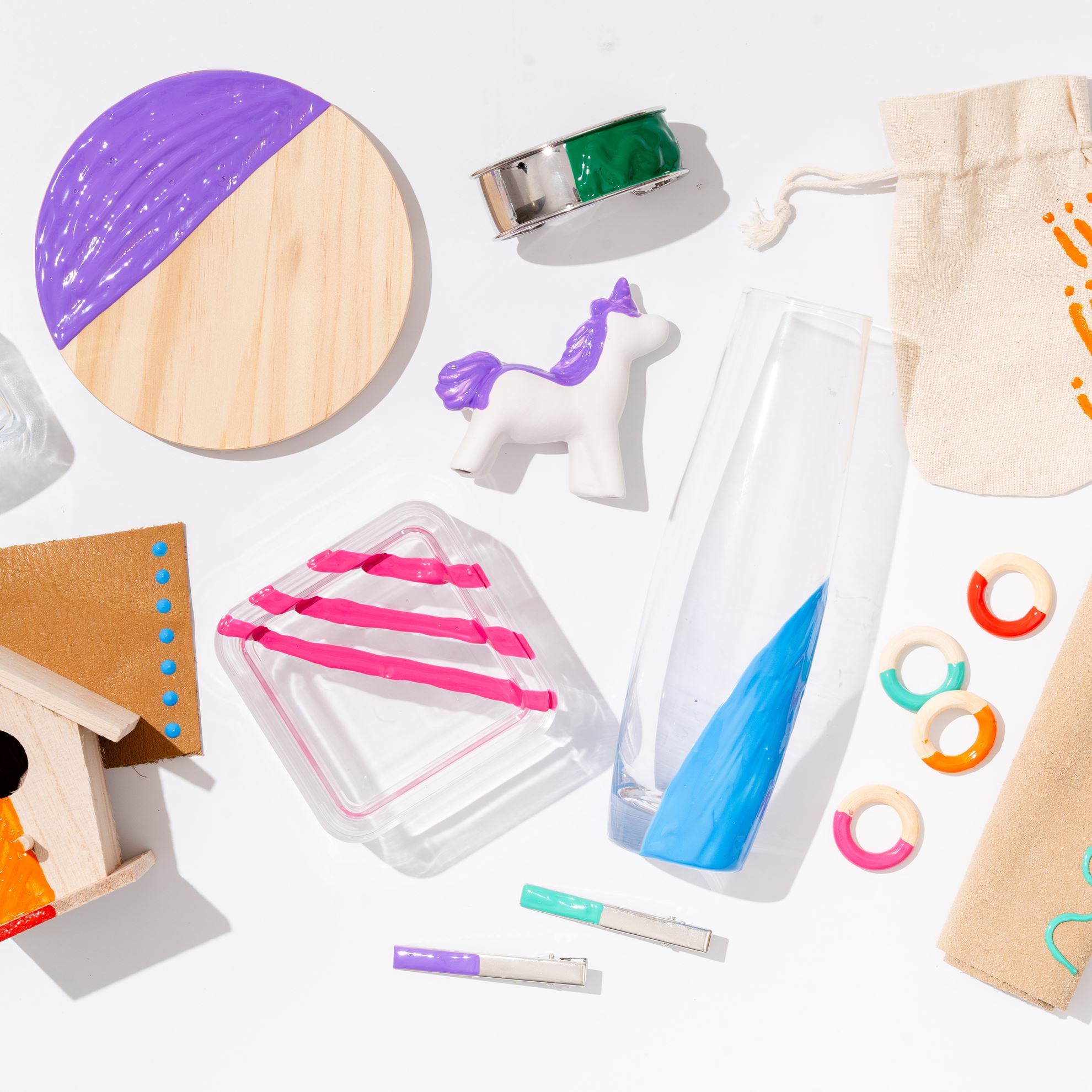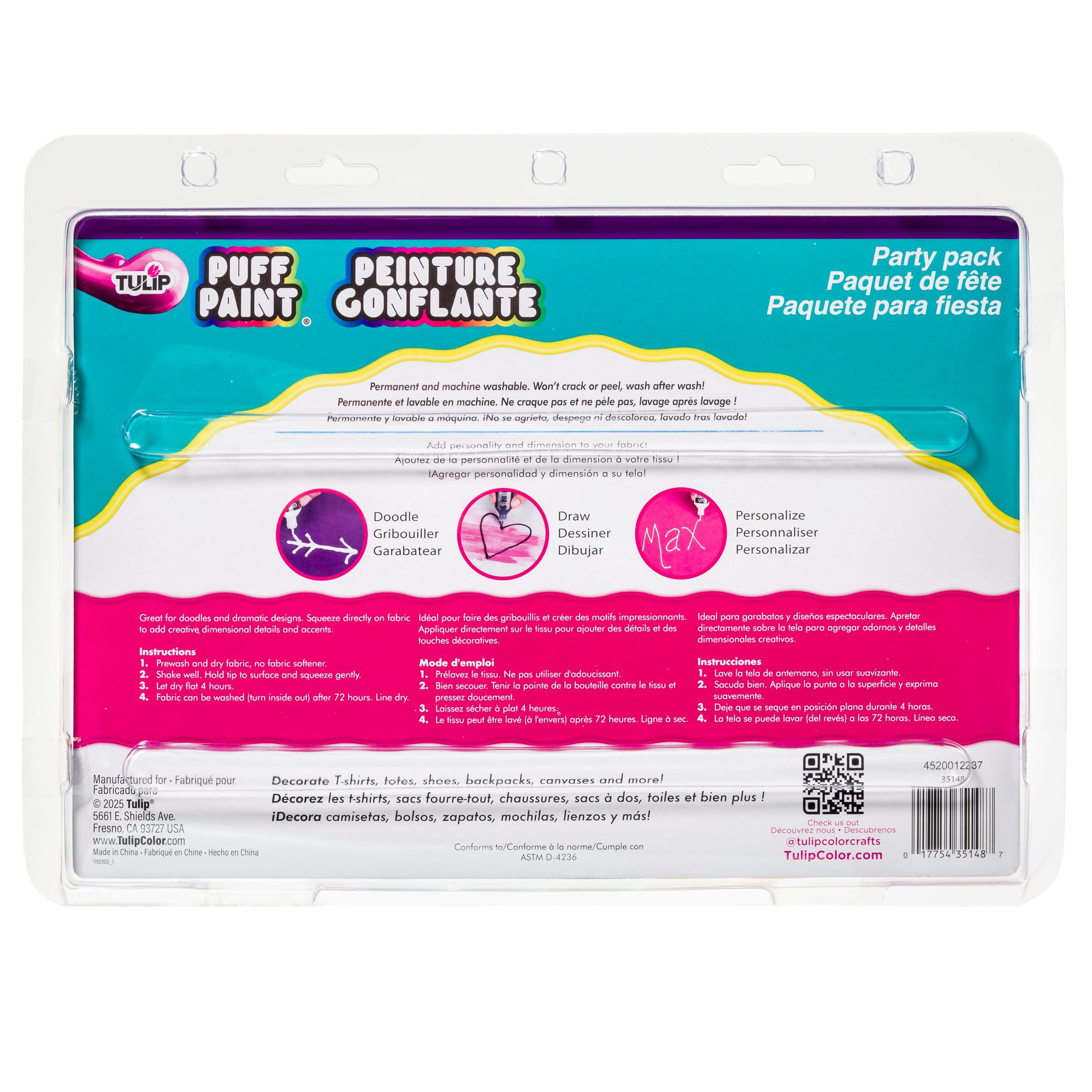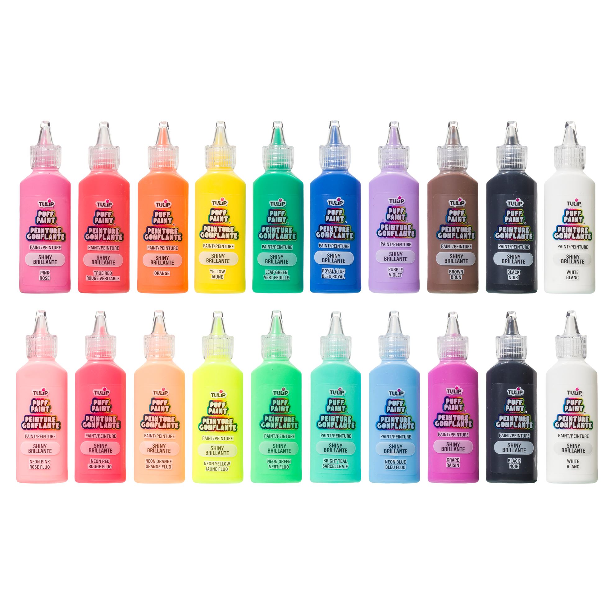 Make your craft and fashion projects stand out with Puff Paint craft paints! Tulip Puff Paint craft paints are nontoxic and dry permanent, flexible, and machine washable with bright dimensional texture that stands out on every project. The Rainbow & Neon Pack includes 20 (.75 fl. oz) shiny Puff Paint craft paints in primary and neon palettes!