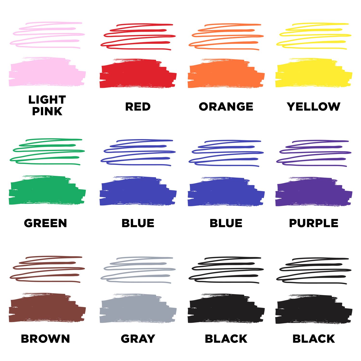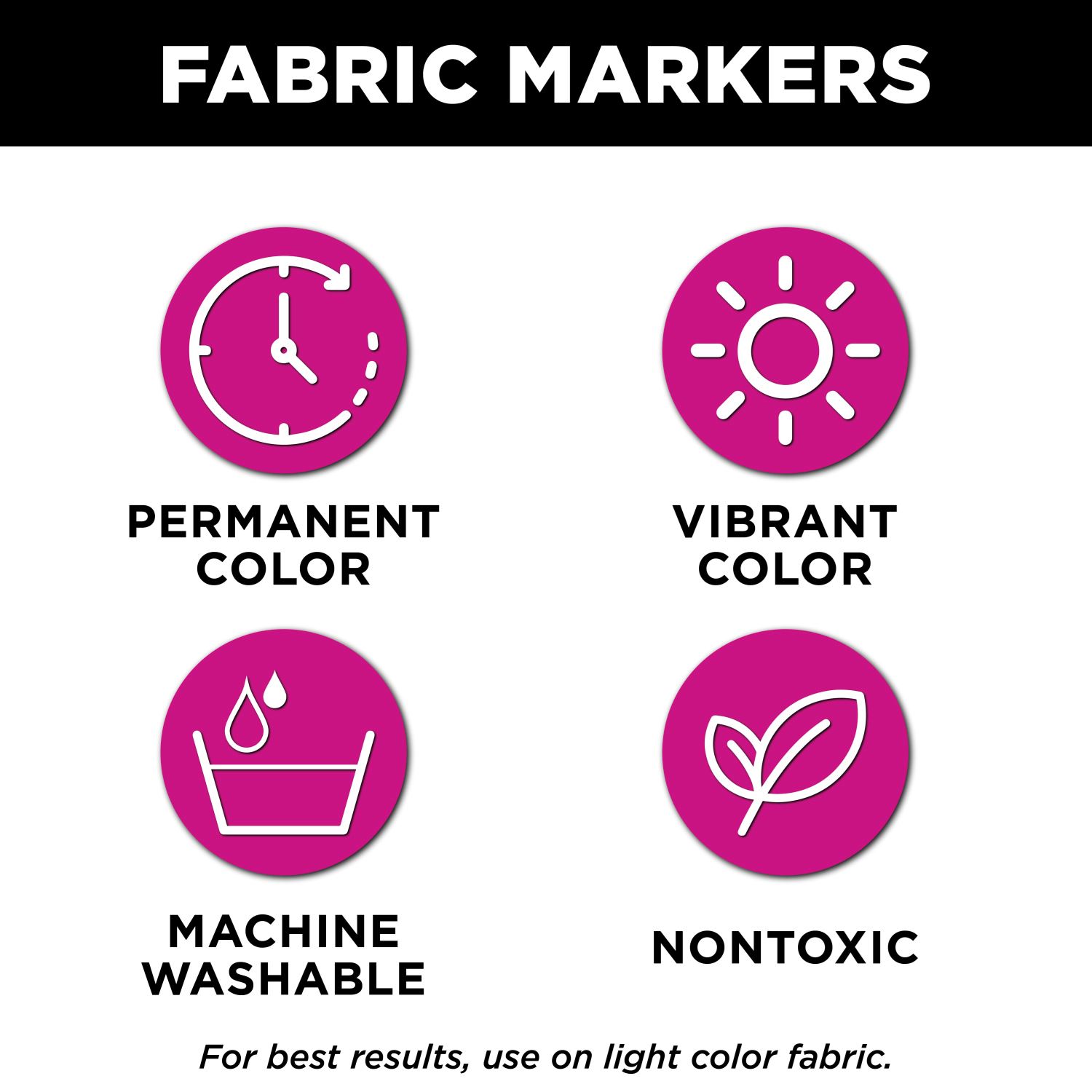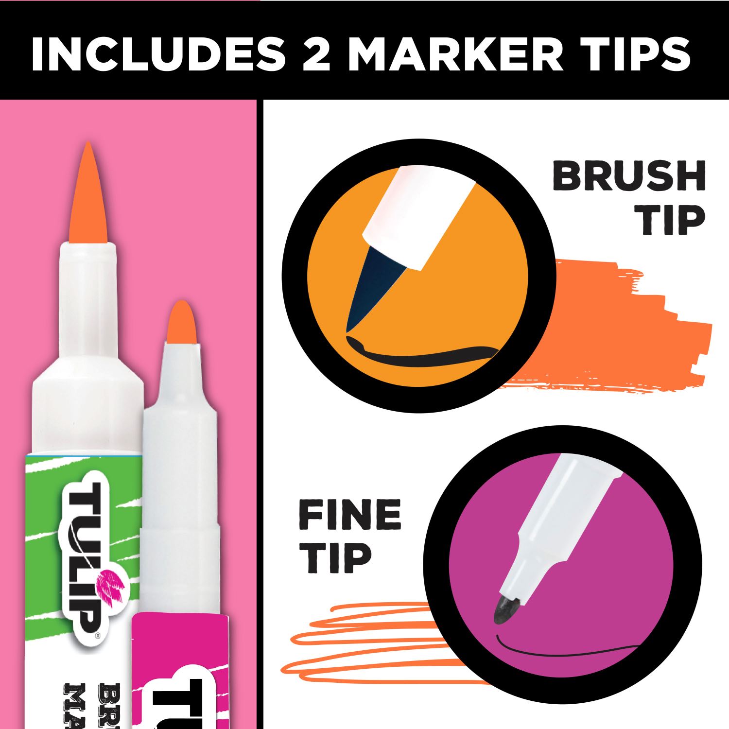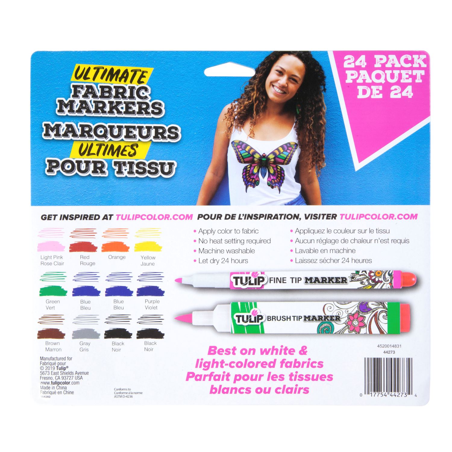 Give your fabrics a boost of color with Tulip Fabric Markers! This Ultimate Rainbow 24 Pack includes 12 fine-tip and 12 brush-tip markers (Light Pink, Red, Orange, Yellow, Green, Blue, Purple, Brown, Gray, Black) that are perfect for versatile drawing and writing on fabrics. Tulip Fabric Markers dry permanently on light-colored fabrics, so let your imagination take over on clothing, shoes, bags & backpacks, and other DIY craft surfaces! The bright and bold premium-color inks keep your creativity from fading, even after multiple machine washes. No heat-setting required.