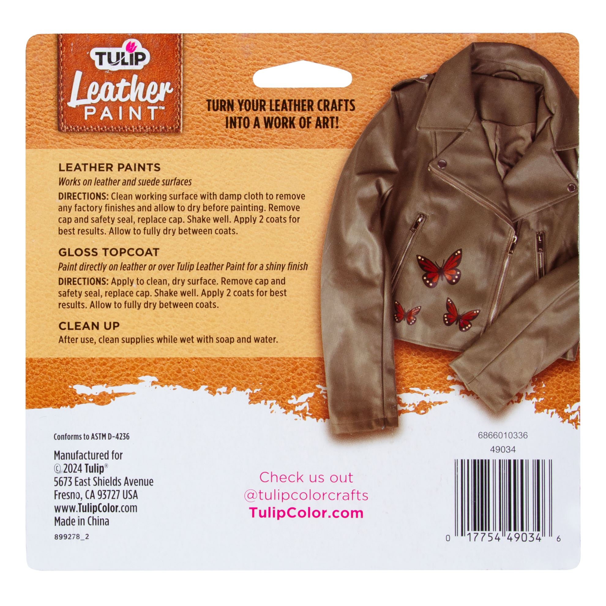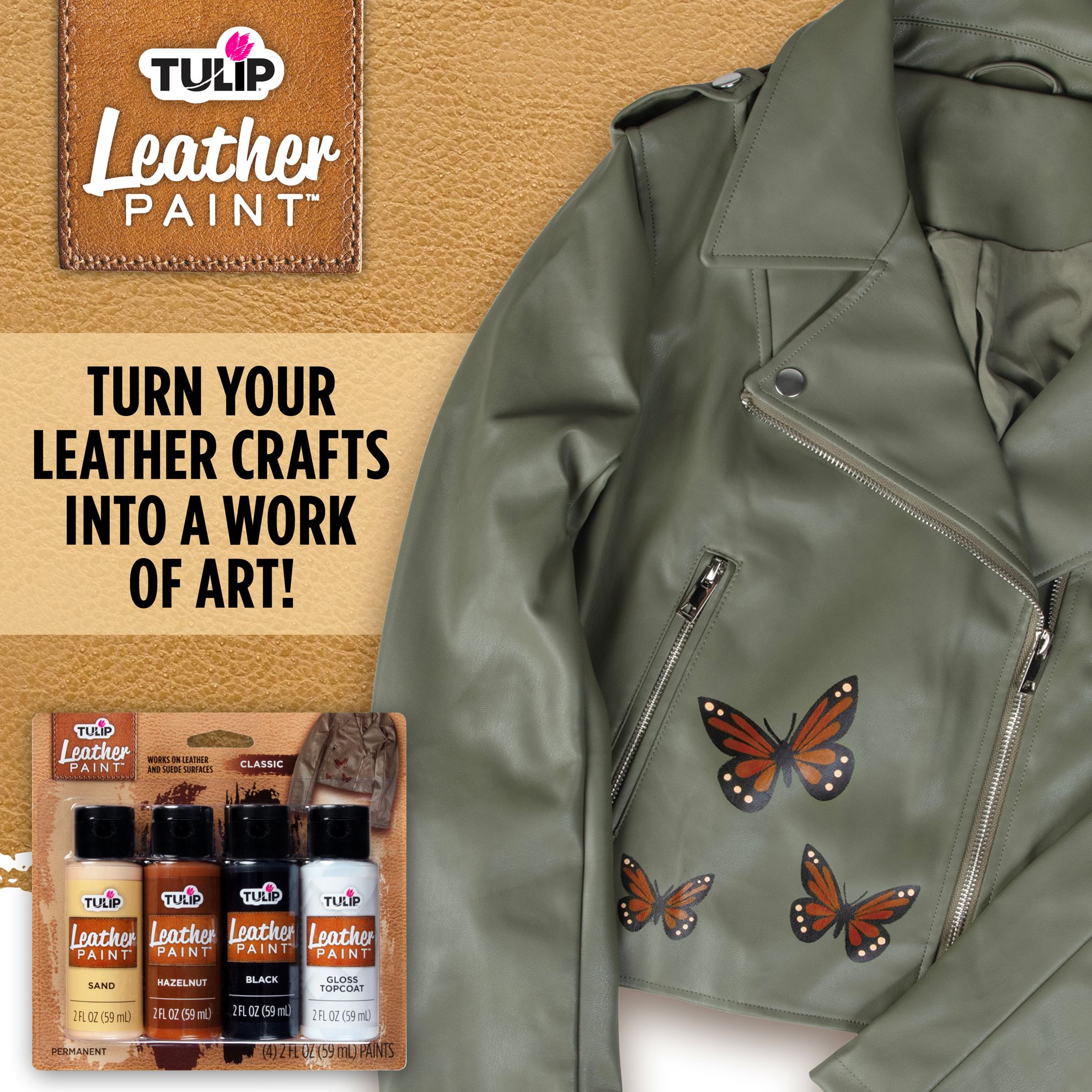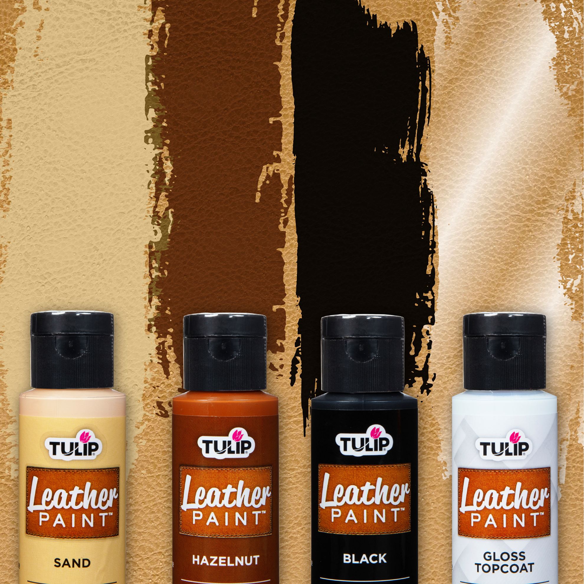 Turn your leather crafts into a work of art with Tulip Leather Paint! Tulip Leather Paint dries with a soft and flexible bond so they won’t crack or crumble with movement. This nontoxic paint dries permanently with a matte finish on leather and suede surfaces. The Classic 4 pack includes 3 (2 fl. oz.) Leather Paints in a rich neutral palette (Sand, Hazelnut, Black) plus 1 (2 fl. oz.) gloss topcoat for a shiny finish.