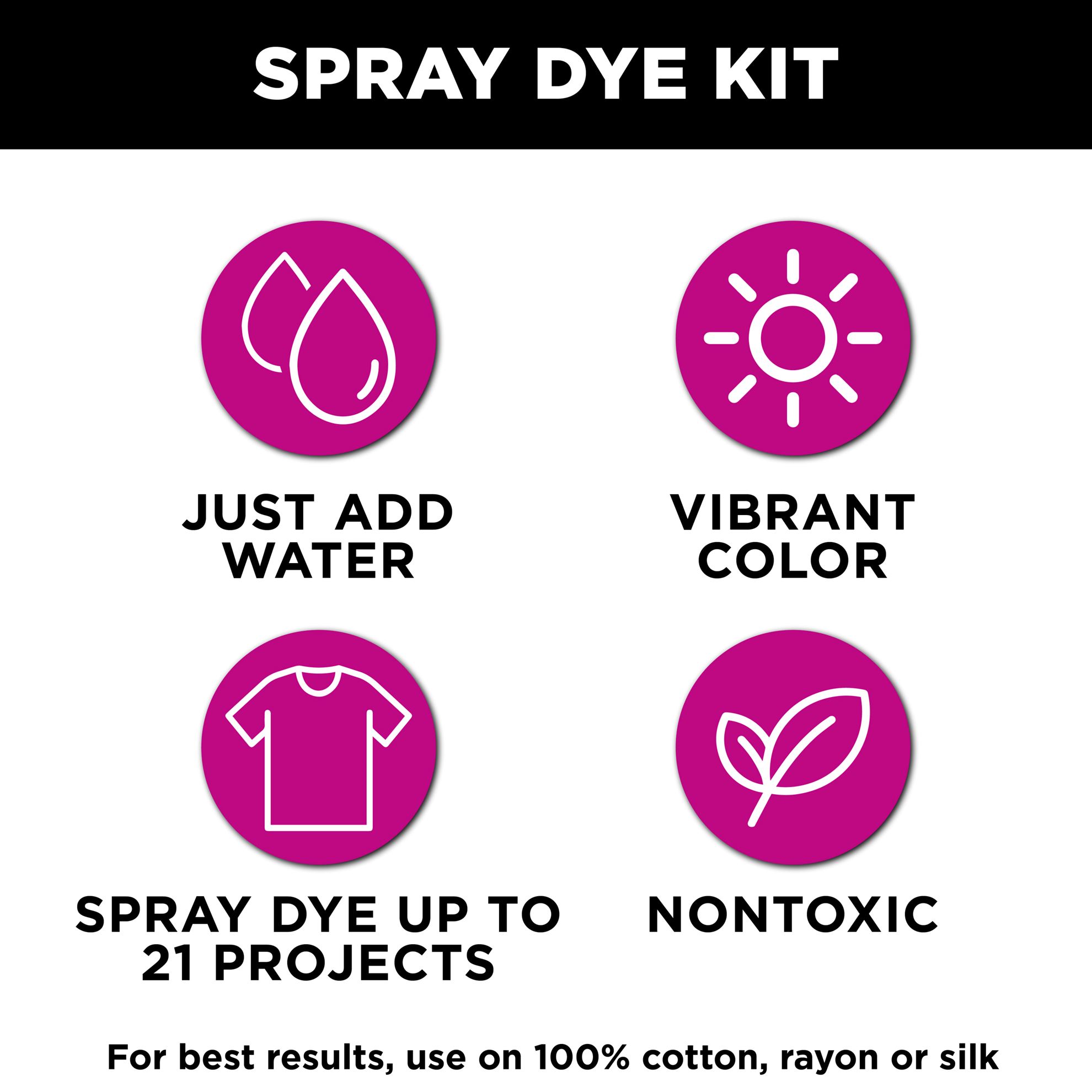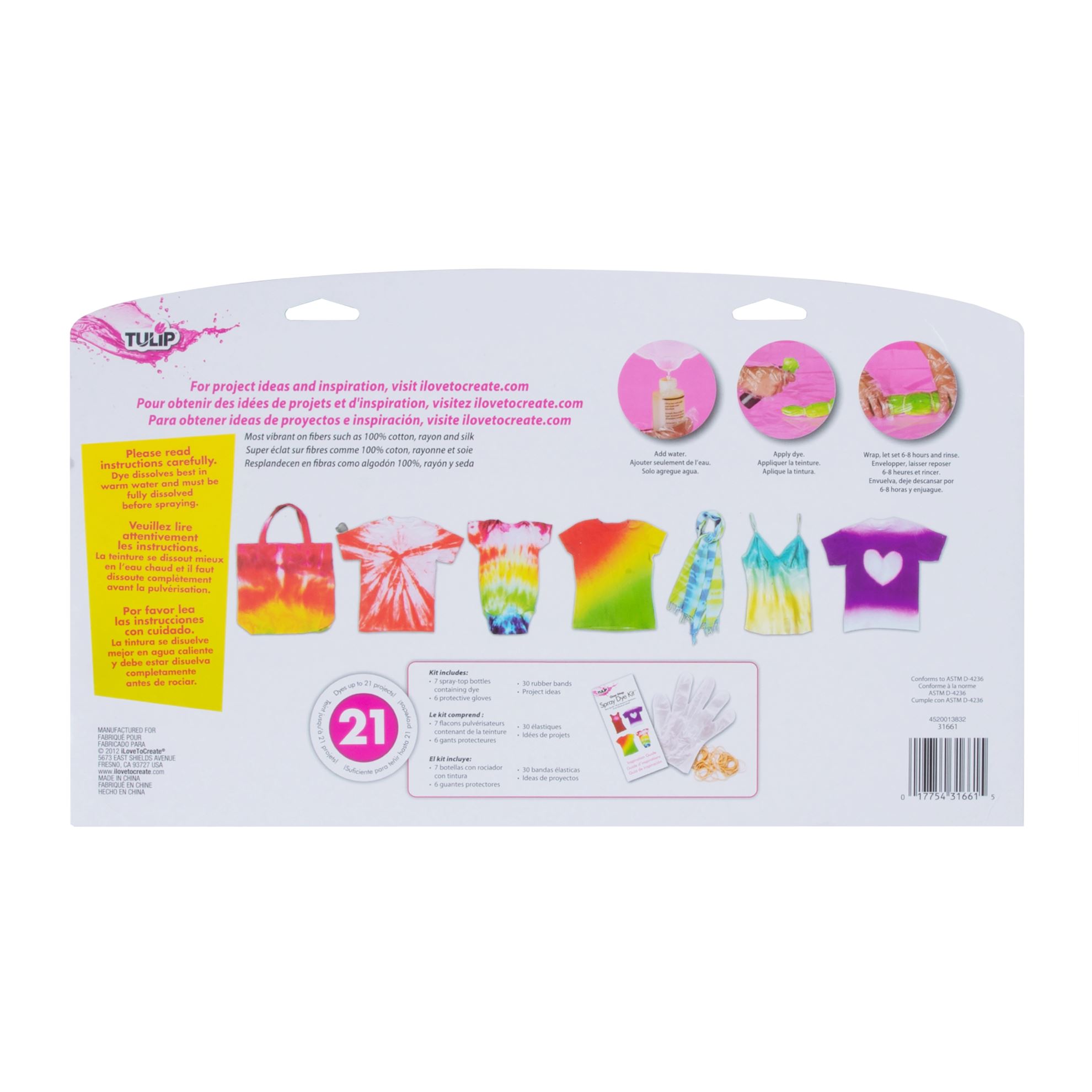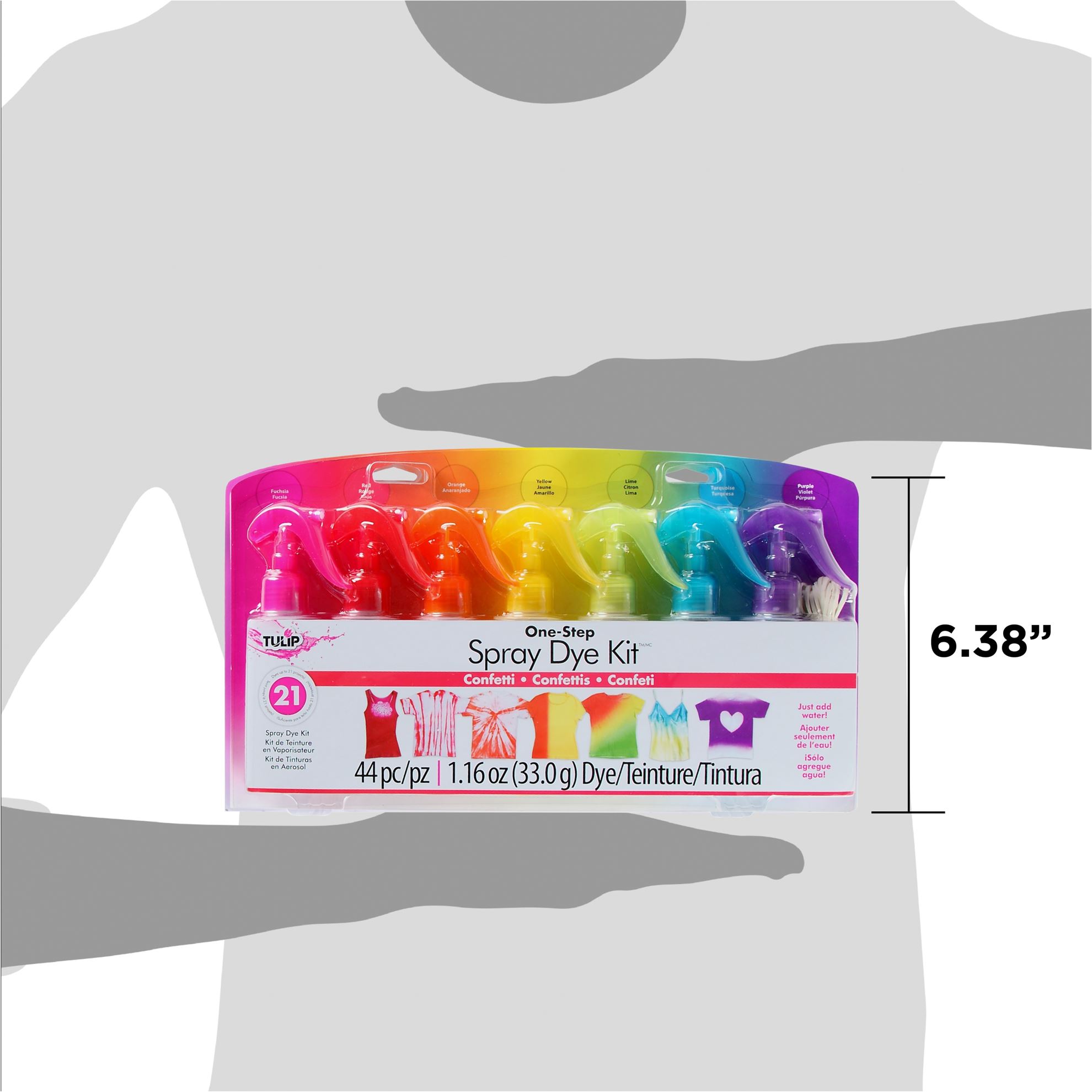 TulThe Tulip Confetti 7-Color One-Step Spray Dye Kit includes 7 (4 fl. oz.) One-Step Dyes in an essential rainbow palette (Fuchsia, Red, Orange, Yellow, Lime, Turquoise, Purple) 6 gloves, 30 rubber bands, and project guide. Dyes up to 21 projects. (Note: project count will vary based on size of garment and amount of dye used.) All Tulip One-Step Dyes are nontoxic and safe for crafters of any age or experience level. One-Step Dyes are formulated to be their best and brightest on natural-fiber fabrics. Dyes are safe to machine wash – colors stay bold through repeated washings.