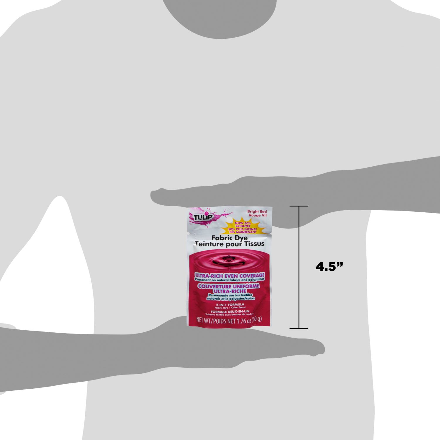 Tulip Fabric Dye is your solution for one-color dyeing, re-dyeing and dip dyeing. This formula utilizes the classic hot water dye method for ultra-rich, even dye coverage and is most vibrant on natural fabrics such as 100% cotton, rayon, linen, and silk. Tulip Fabric Dyes are mixable so you can customize every project with beautiful, permanent color. Contains 1.76 oz of Bright Red Fabric Dye; one packet makes 1 gallon of dye, which can be used to dye up to ½ pound of fabric. (Note: This is an estimate and actual amount of dye per project and dye vibrancy depends on the user, the size of the fabric, and the fabric itself.)
