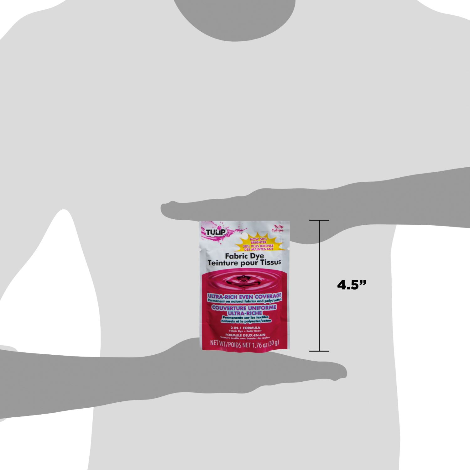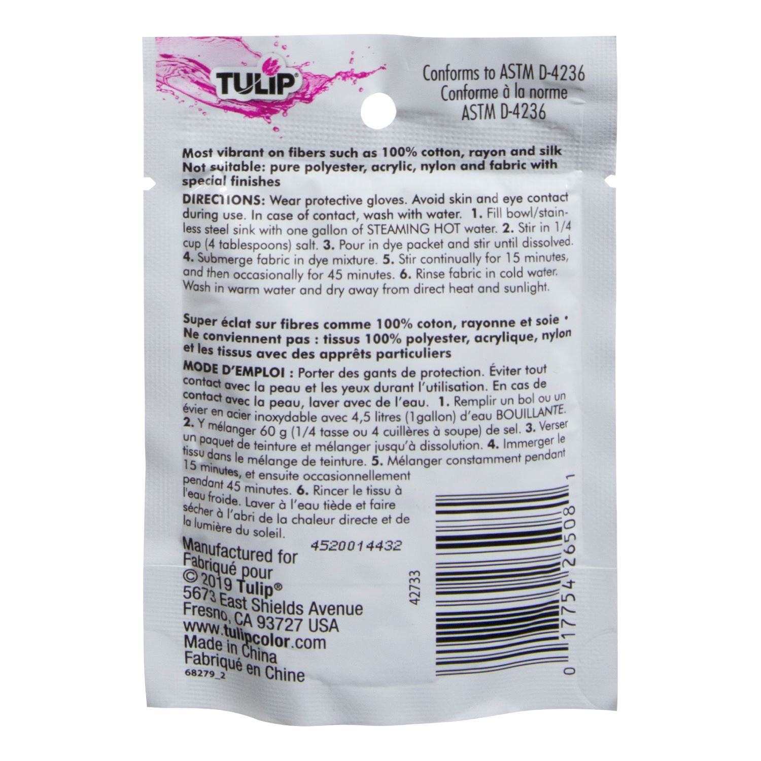Tulip Fabric Dye is your solution for one-color dyeing, re-dyeing and dip dyeing. This formula utilizes the classic hot water dye method for ultra-rich, even dye coverage and is most vibrant on natural fabrics such as 100% cotton, rayon, linen, and silk. Tulip Fabric Dyes are mixable so you can customize every project with beautiful, permanent color. Contains 1.76 oz of Tulip Fabric Dye; one packet makes 1 gallon of dye, which can be used to dye up to ½ pound of fabric. (Note: This is an estimate and actual amount of dye per project and dye vibrancy depends on the user, the size of the fabric, and the fabric itself.)