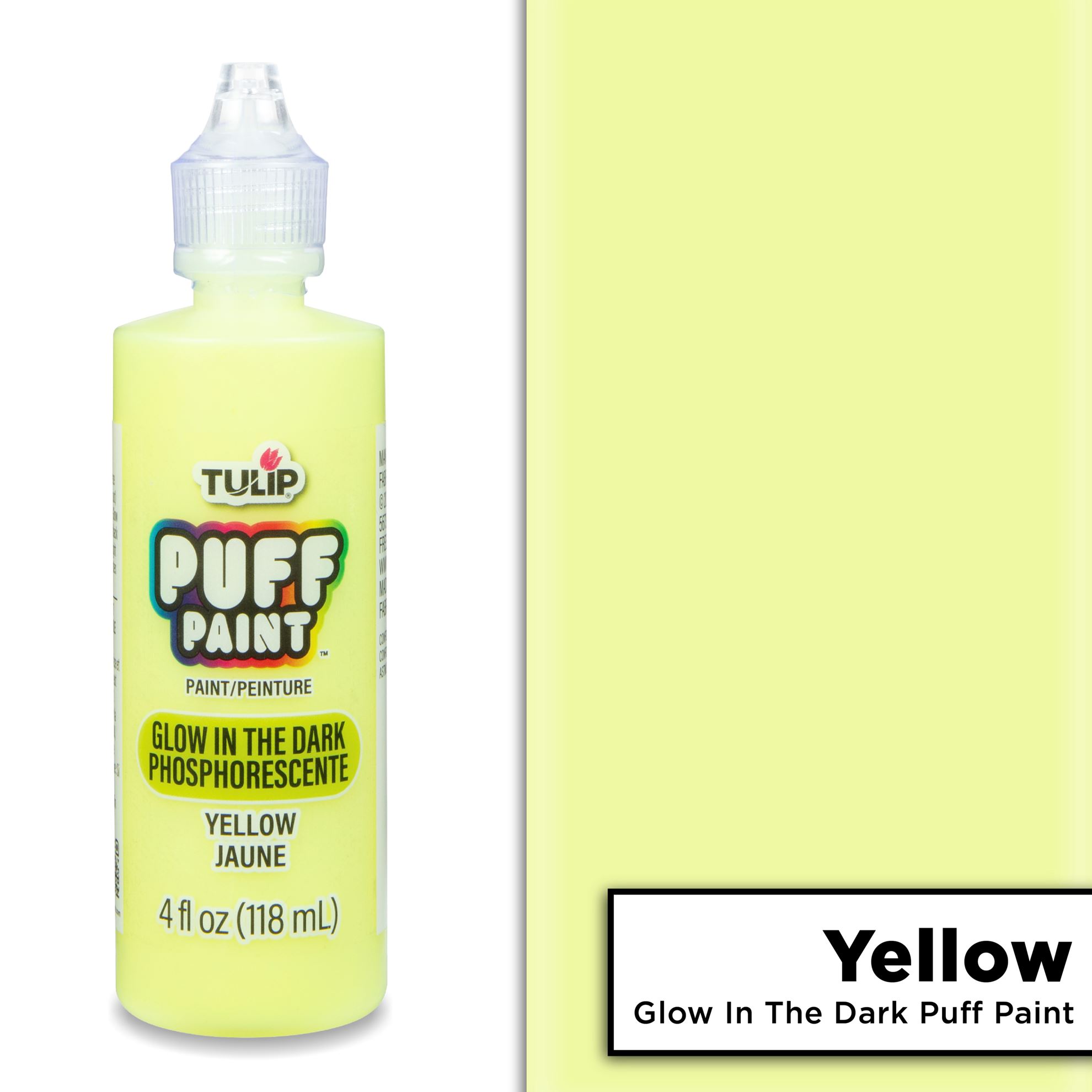 Make your craft and fashion projects stand out with Puff Paint! Tulip Puff Paints dry permanent, flexible and machine washable with glow in the dark, dimensional texture that stands out on every project. These nontoxic paints are used by crafters of all ages and skill levels on everything from educational crafts to statement T-shirts, canvas art, accessories, gift giving, seasonal décor and so much more!To activate, expose Glow Paint to UV light source, such as outdoor or black light, for at least one minute.Includes 1 (4 fl. oz) bottle of Glow in the Dark Yellow Puff Paint.